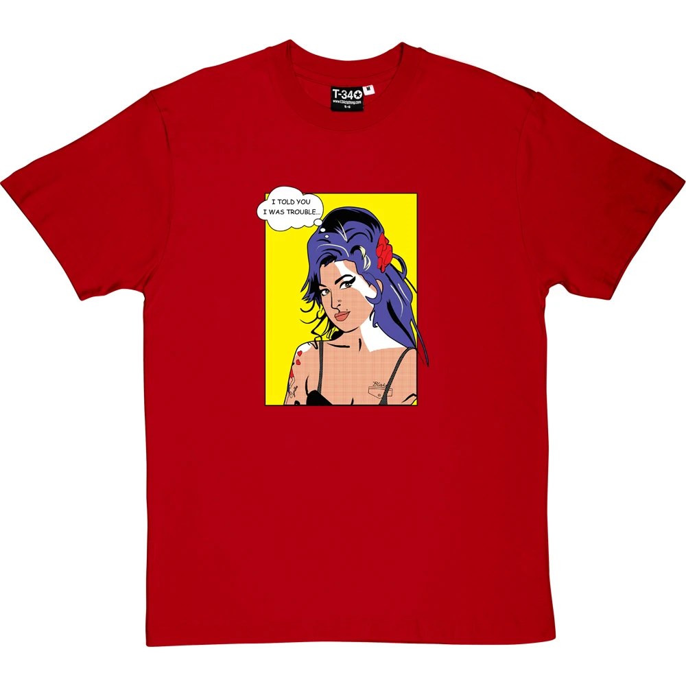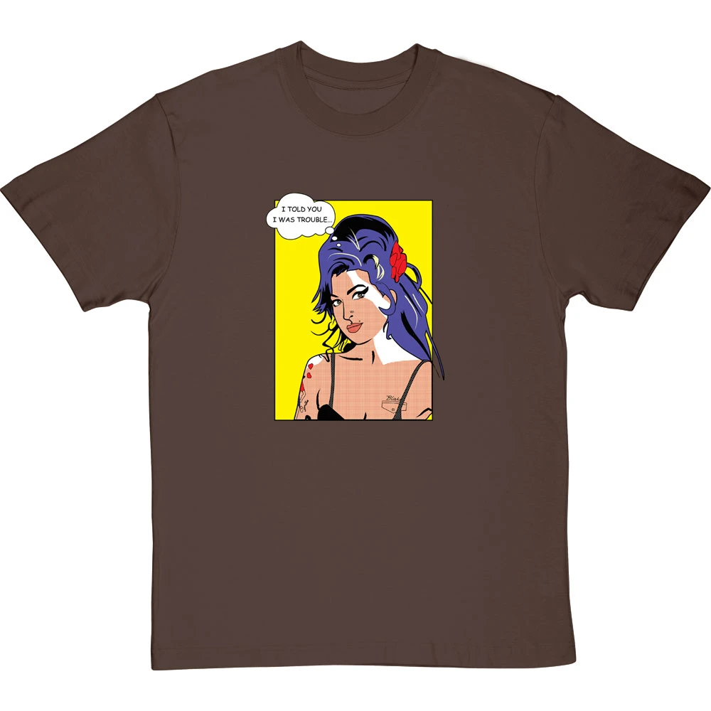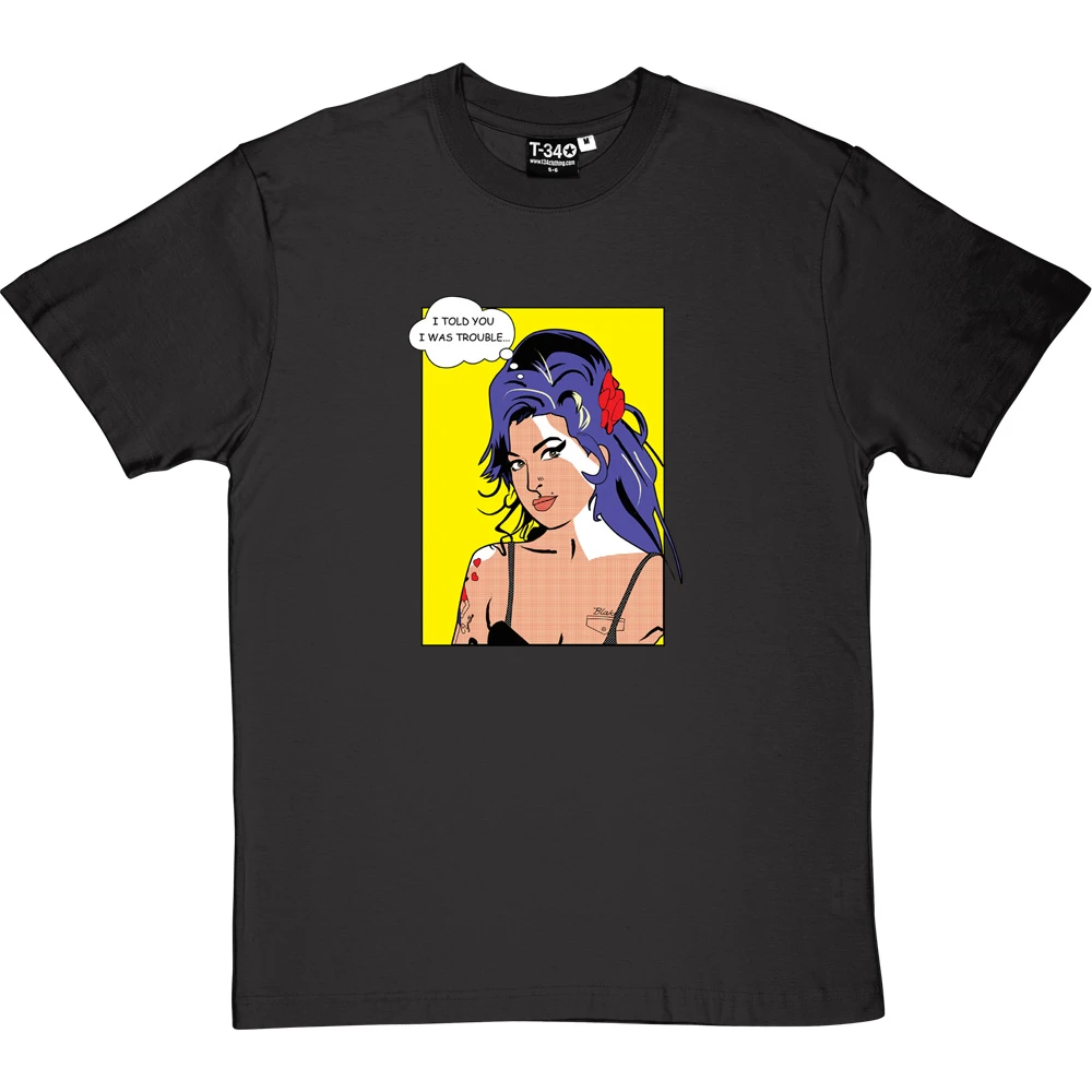 21st century musical icon Amy Winehouse is depicted here in the instantly recognizable style of a Roy Lichtenstein print. This t-shirt design steals a line from one of Ms. Winehouse’s most famous songs: “I told you I was trouble”.