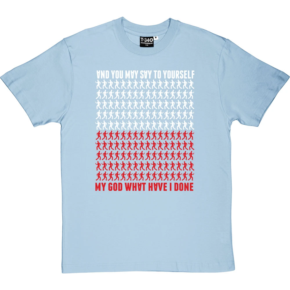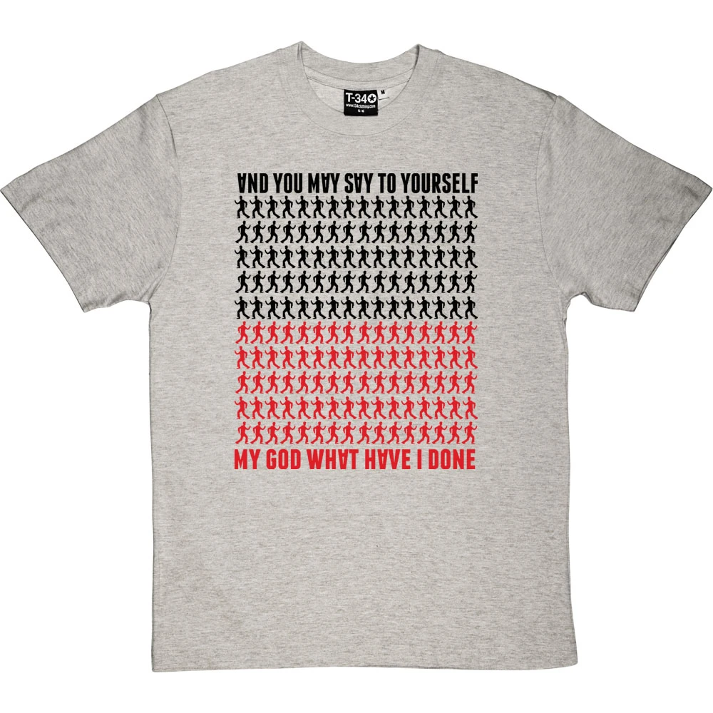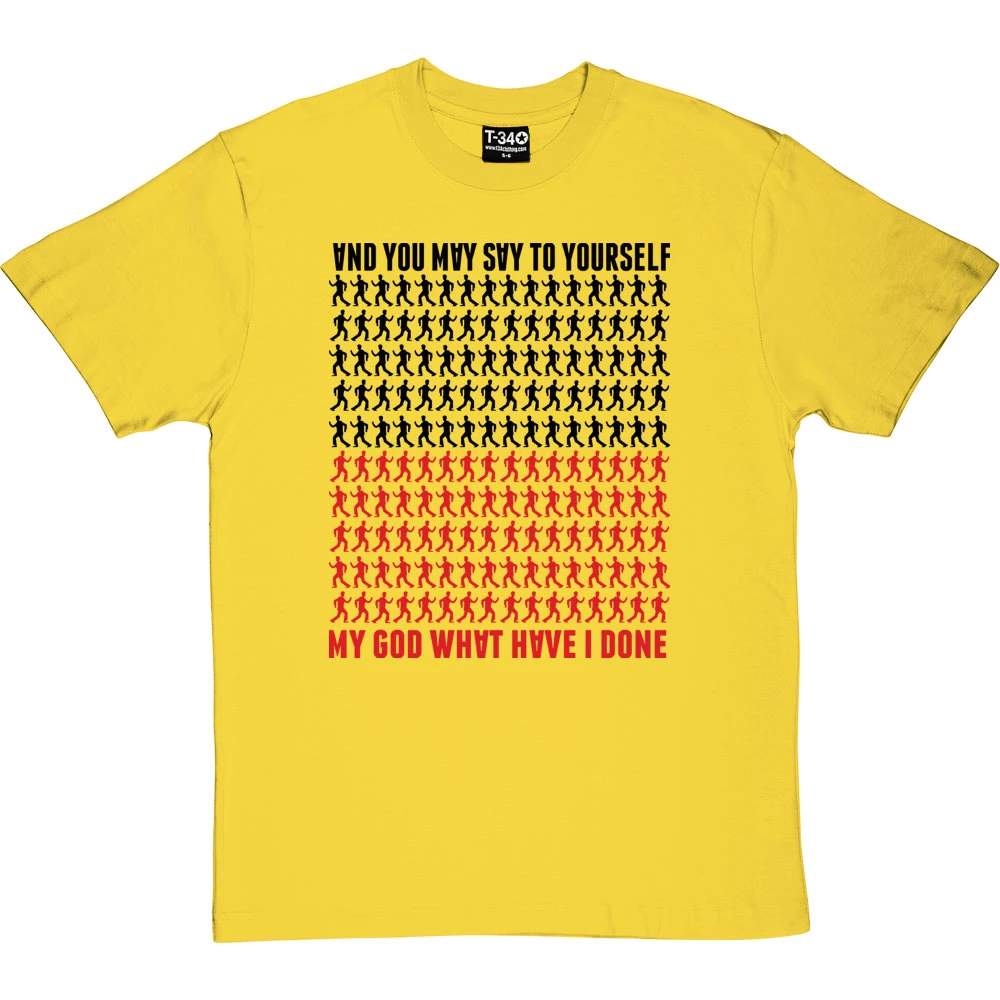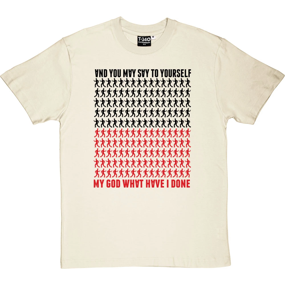 …My God! What have I done? A design inspired by the Talking Heads Lyrics of the popular hit ‘Once In A Lifetime’. This t-shirt features some of the moves from the famous video, the upside down letters of the album cover and the colours of the Talking Heads Logo as depicted on many of their hit albums.
