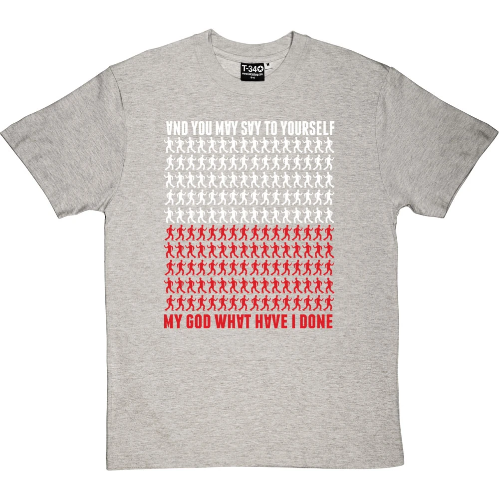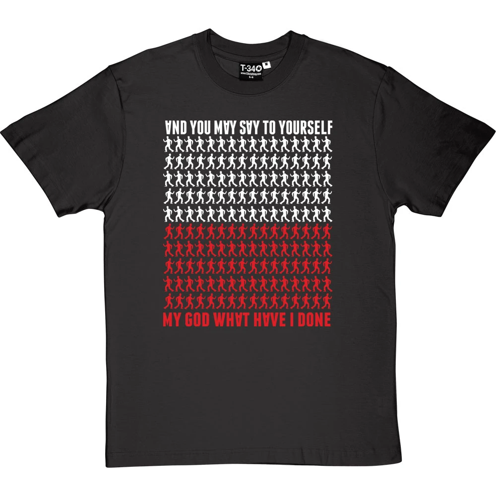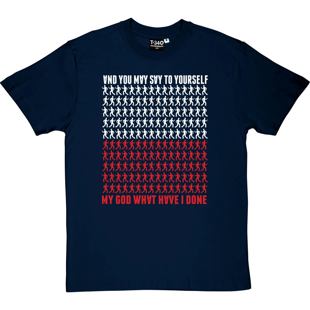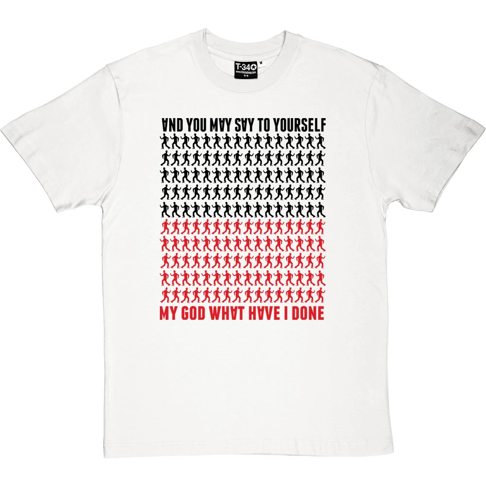 …My God! What have I done? A design inspired by the Talking Heads Lyrics of the popular hit ‘Once In A Lifetime’. This t-shirt features some of the moves from the famous video, the upside down letters of the album cover and the colours of the Talking Heads Logo as depicted on many of their hit albums.