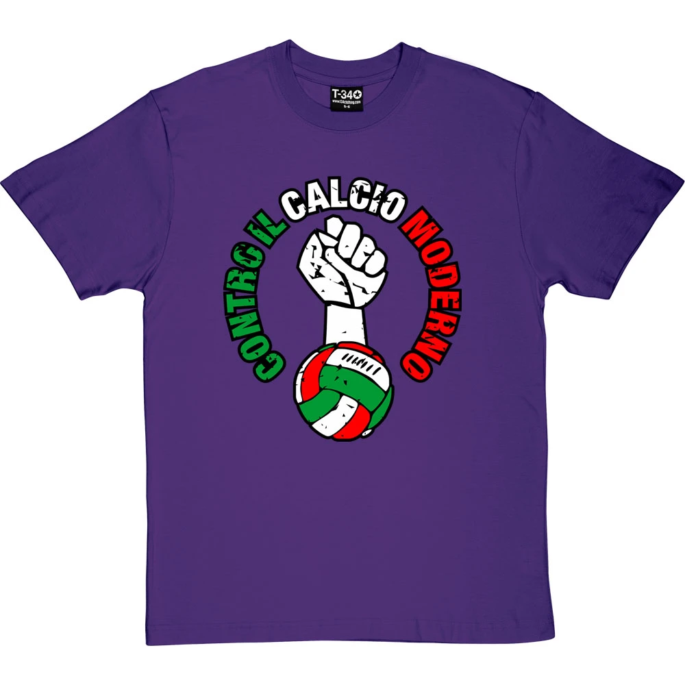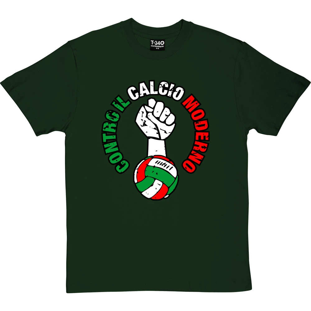 An Italian version of the t-shirt celebrating the campaign to return football to the masses: against modern football – printed in Italian red, white, and green.