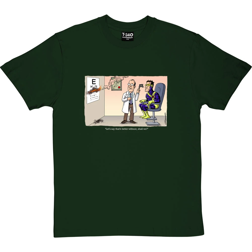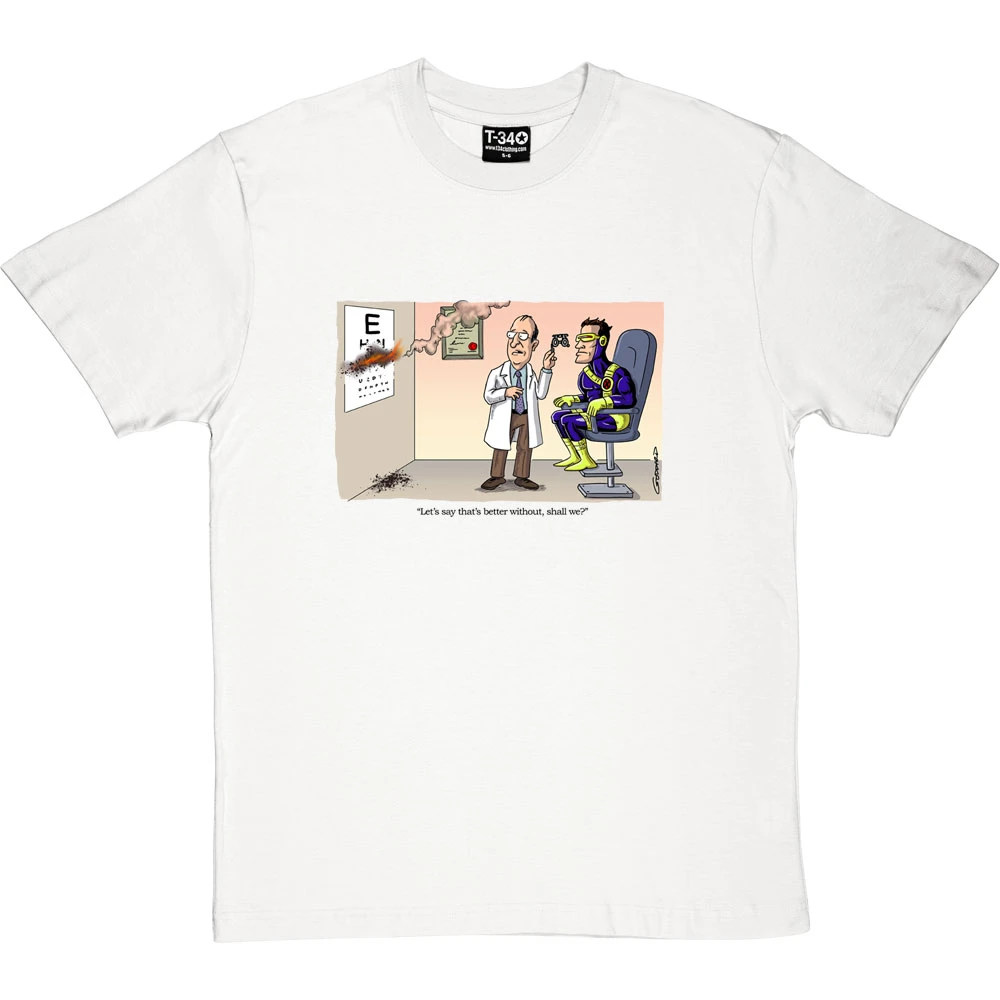 Pity the poor optician who has to cope with Cyclops’ laser-beam emitting eyes. “Let’s say that’s better without, shall we?”. A cartoon by renowned cartoonist Clive Goddard.