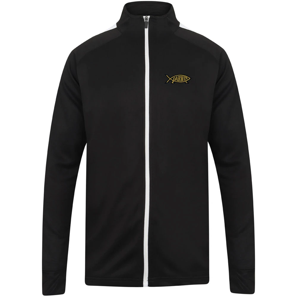 An embroidered version of the iconic “Darwin Fish” logo on an embroidered, knitted tracksuit top. The Darwin fish logo is a humorous and irreverent symbol that is used to show support for the theory of evolution and to poke fun at religious beliefs. The logo features a fish with legs and the word “Darwin” written inside, mimicking the Christian ichthys fish symbol that is often displayed on cars and other items. The Darwin fish logo was created in the early 1990s as a response to the Christian fundamentalist movement in the United States, which sought to promote creationism and deny the validity of evolution.