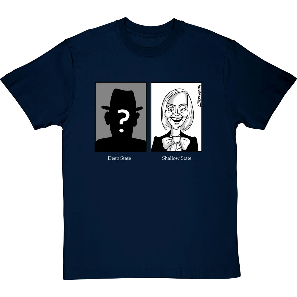If we assume that the deep state is a mysterious covert government conspiracy to exert control over the population, so then Liz Truss is instead the definition of the shallow state: vacuous, unpopular, and lacking in all authority. Based on a cartoon by cartoonist Clive Goddard.