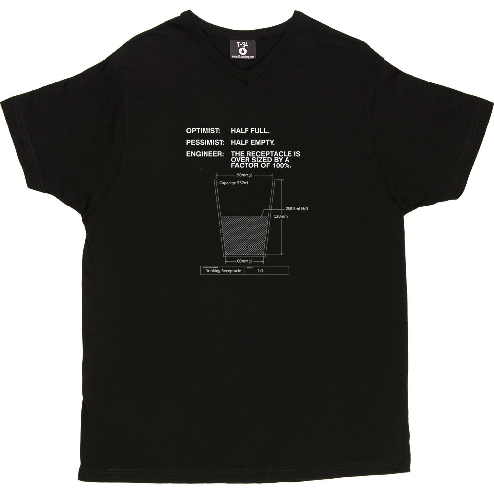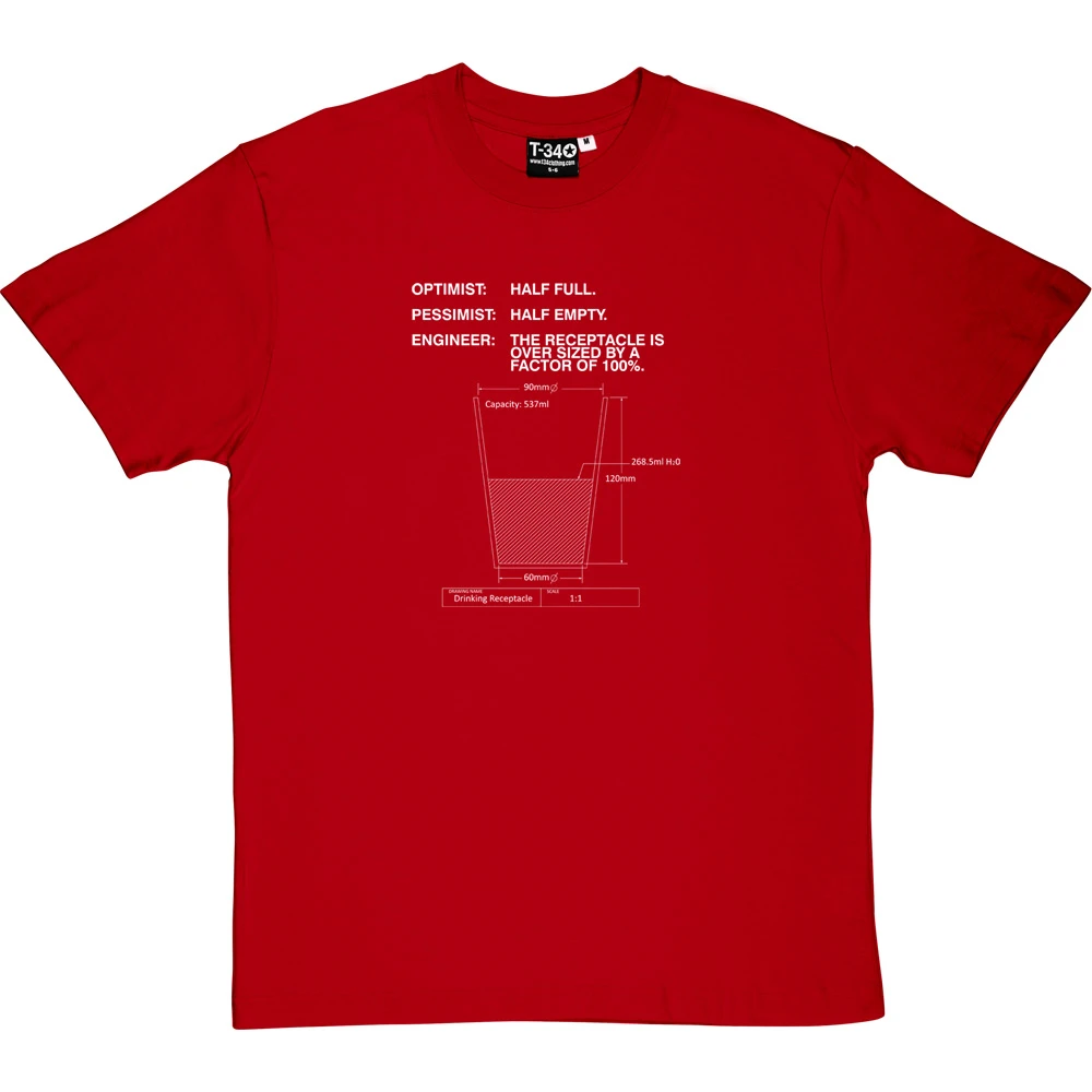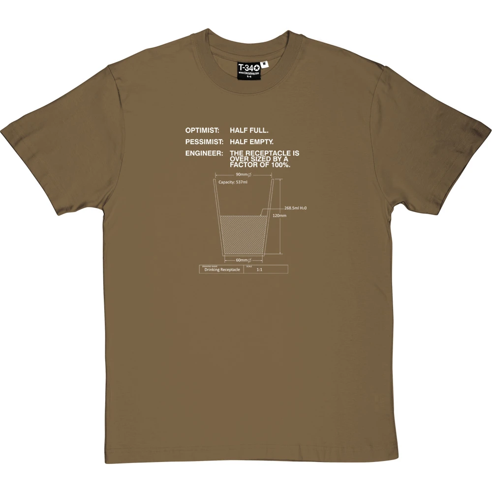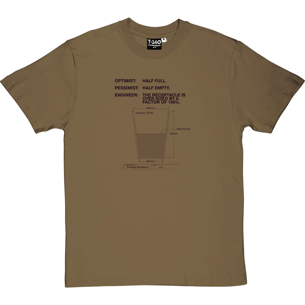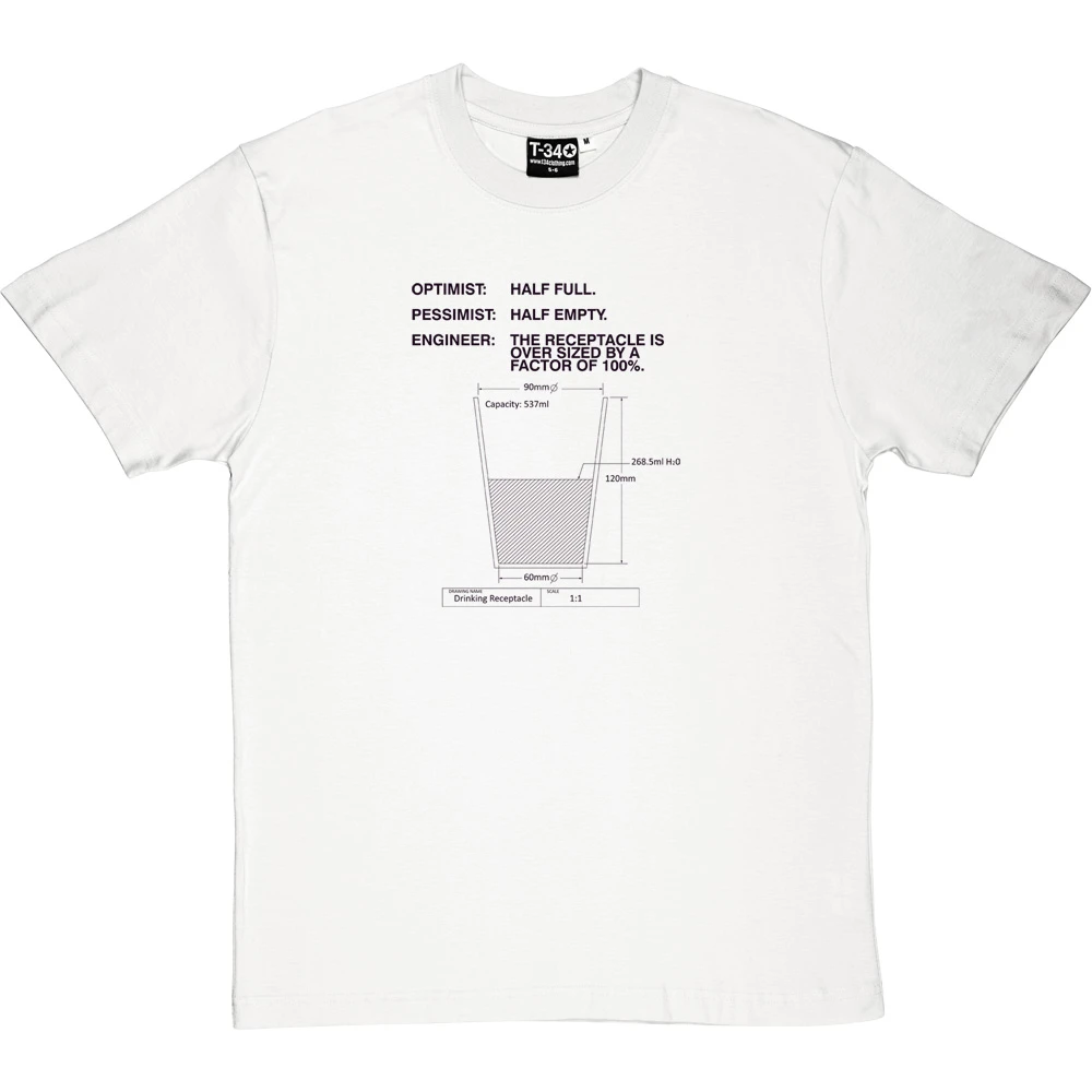 Featuring a technical diagram of a glass, filled half-way with water: The optimist says the glass is half full. The pessimist says the glass is half empty. The engineer says the receptacle is over sized by a factor of 100%.