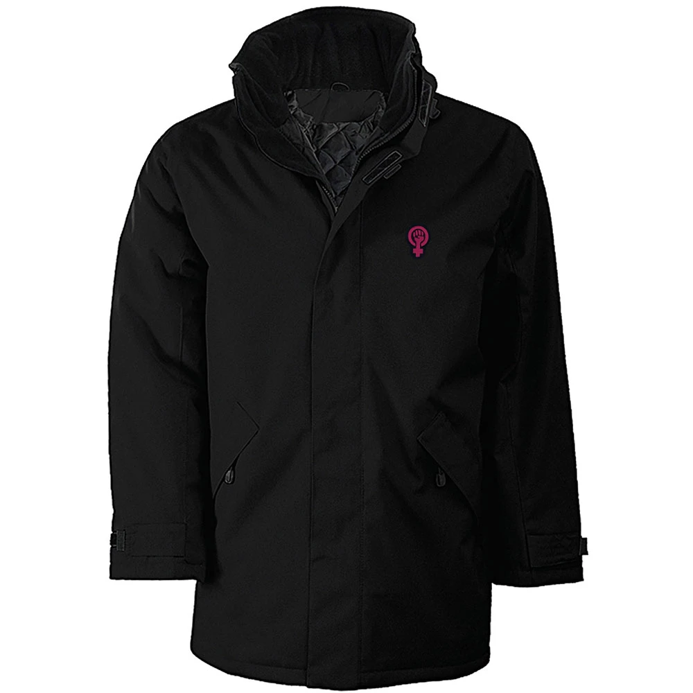 An embroidered version of our “Feminist Fist” logo on a warm, showerproof parka jacket. The feminist fist logo is a symbol of empowerment and strength for the feminist movement. The logo features a raised fist within the symbol of the female gender. This design represents unity and resistance against gender inequality, sexism, and discrimination. The feminist fist logo has its roots in the activism of the 1960s and 1970s when women were fighting for equal rights and challenging the patriarchal system. The raised fist was a symbol of solidarity during this time, used by various social justice movements to express unity and strength in the face of oppression.