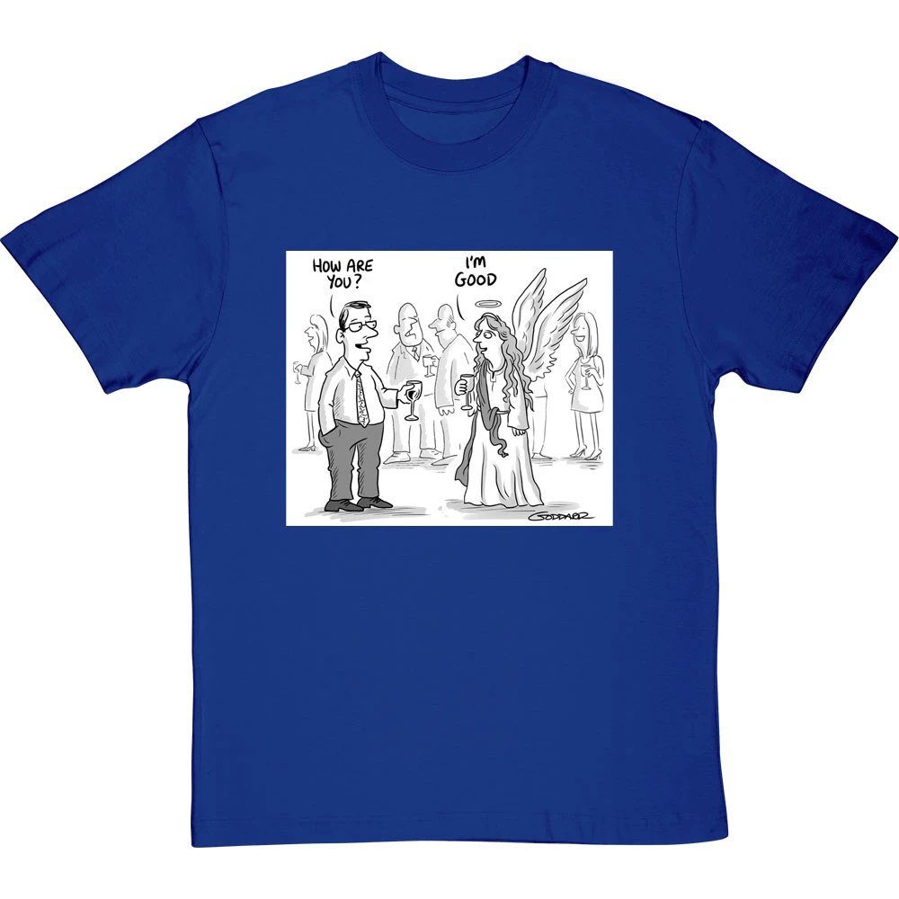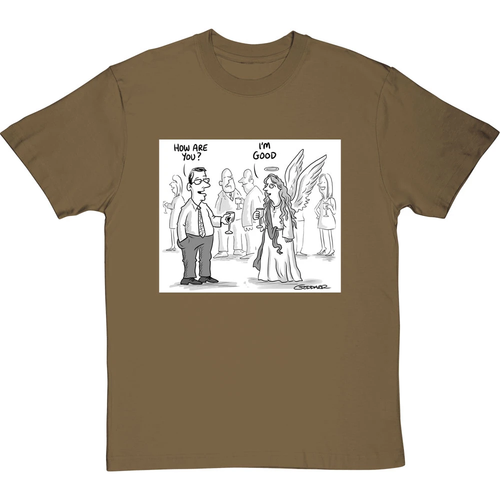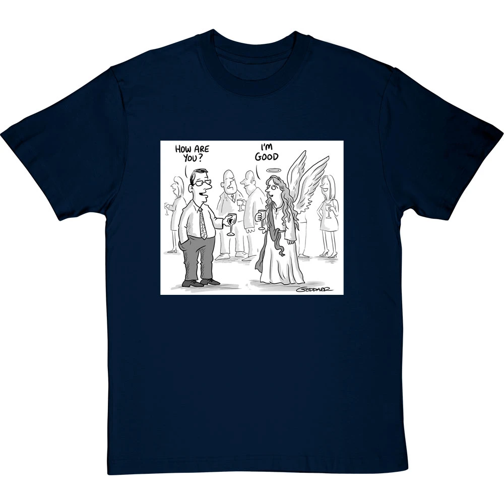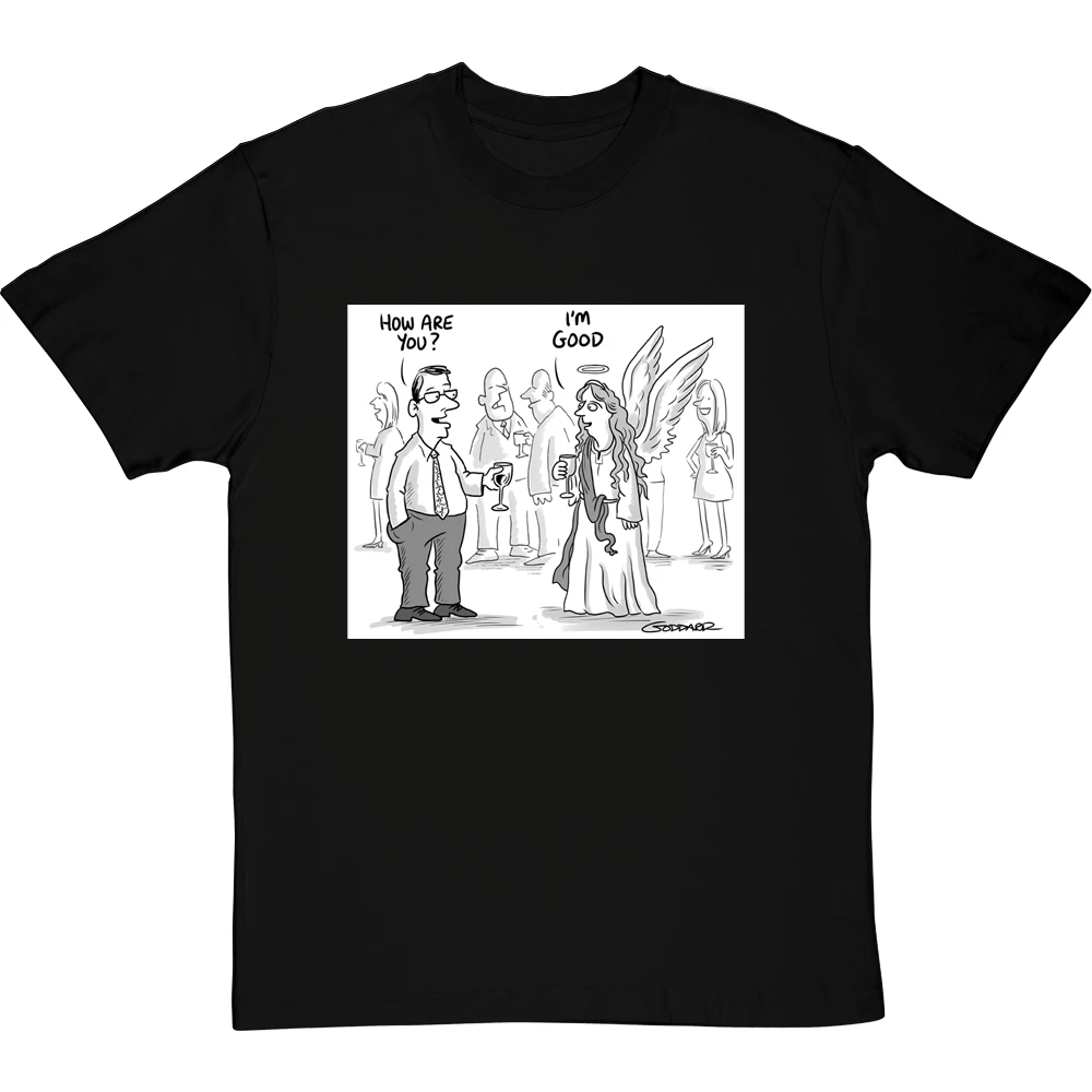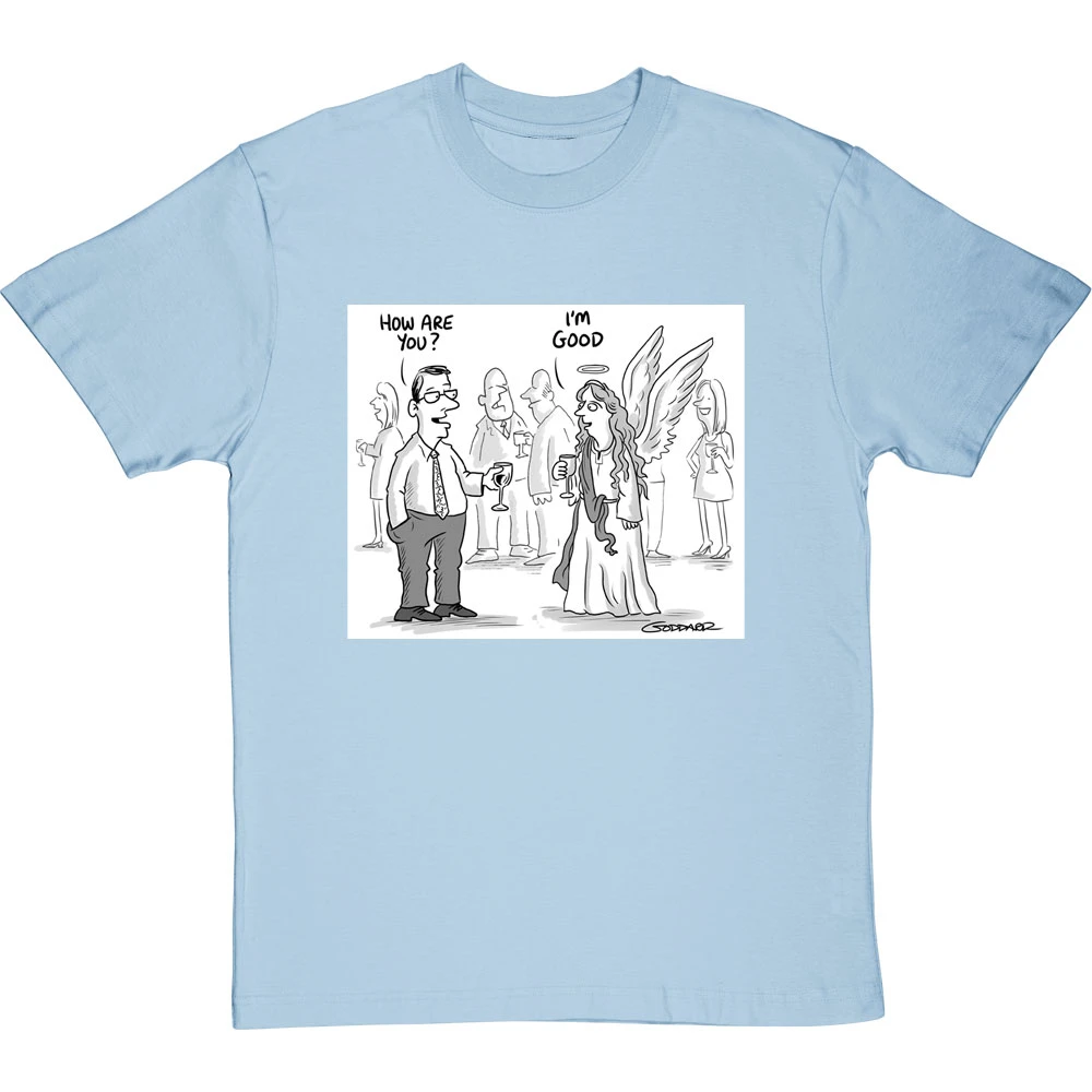 Clearly the obvious answer when you ask an angel how they are: “I’m good, obviously”. A design based on a cartoon by cartoonist Clive Goddard.
