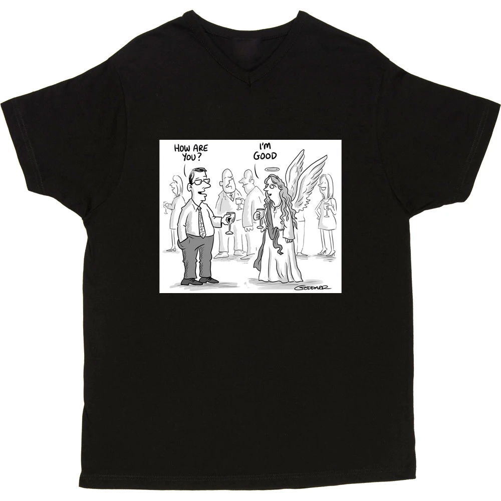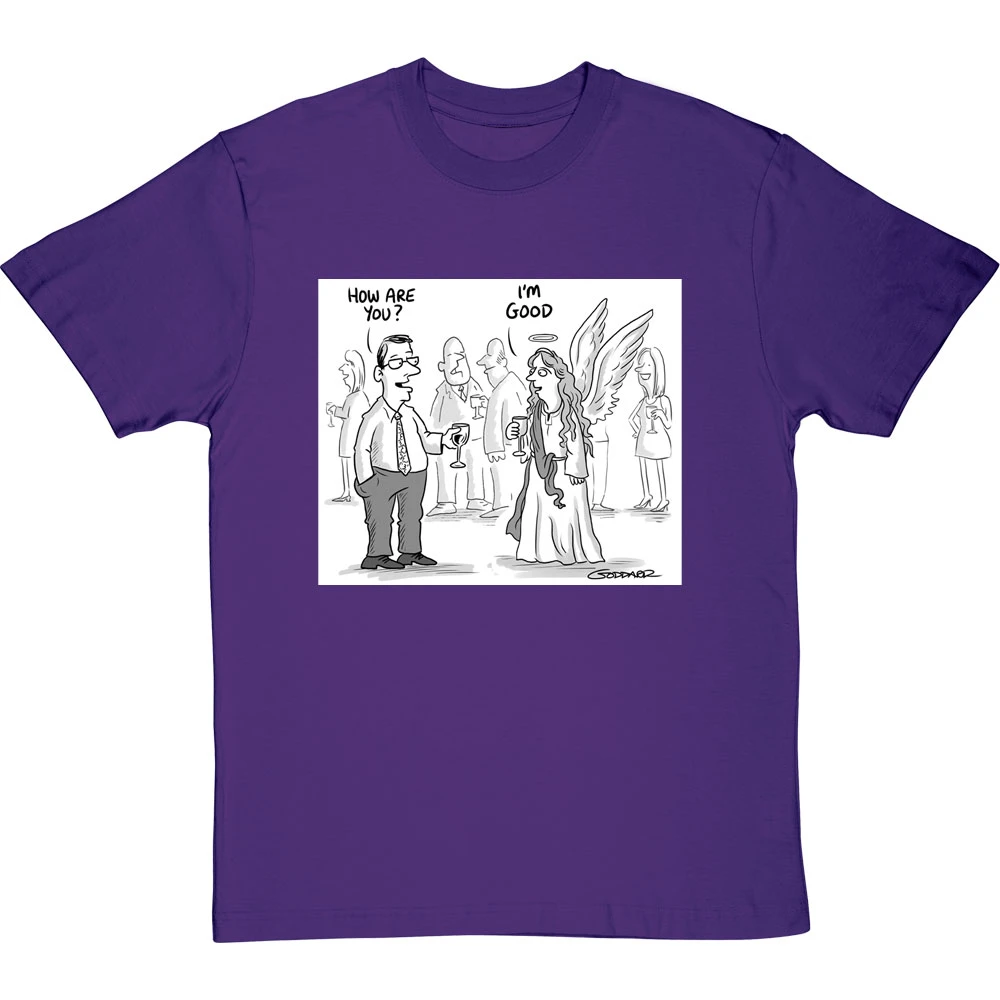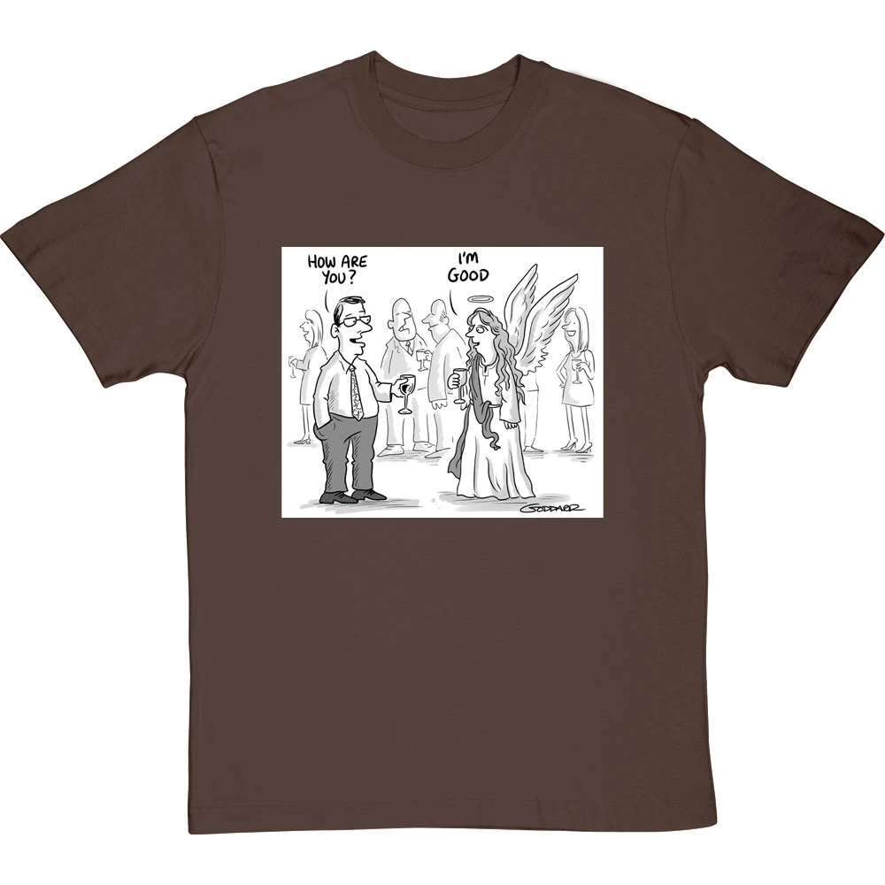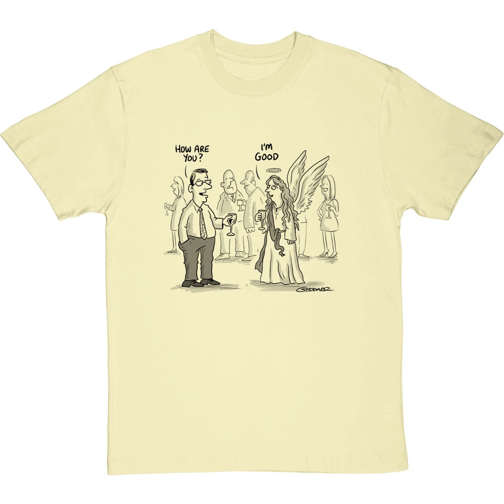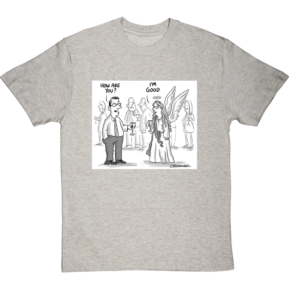Clearly the obvious answer when you ask an angel how they are: “I’m good, obviously”. A design based on a cartoon by cartoonist Clive Goddard.