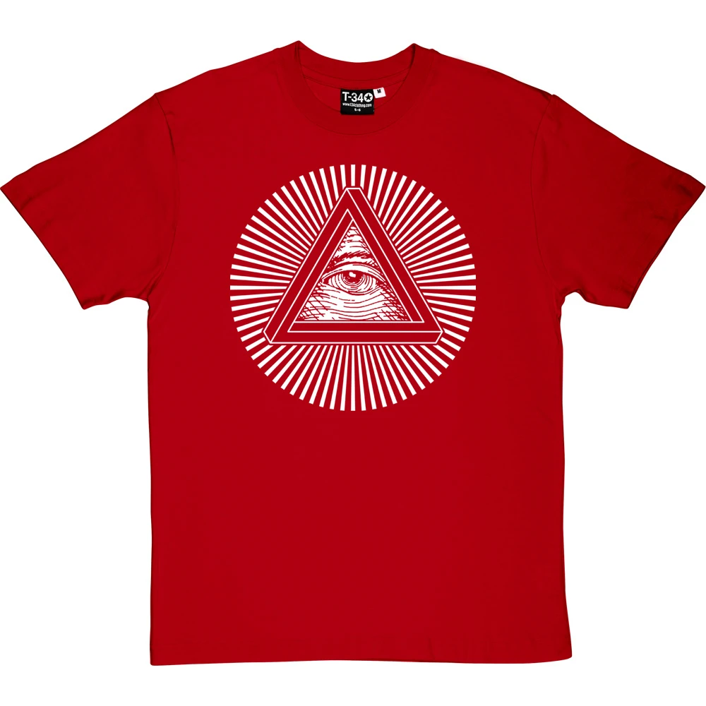 The Eye of Providence set inside a Penrose Triangle. Evidence that an all-powerful secret society controls world affairs, that the Freemasons are establishing a New World Order, that the moon controls your thoughts or simply that the whole thing has been fabricated by some nutty conspiracy theorists with far too much time on their hands.