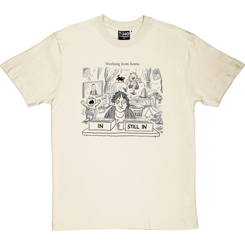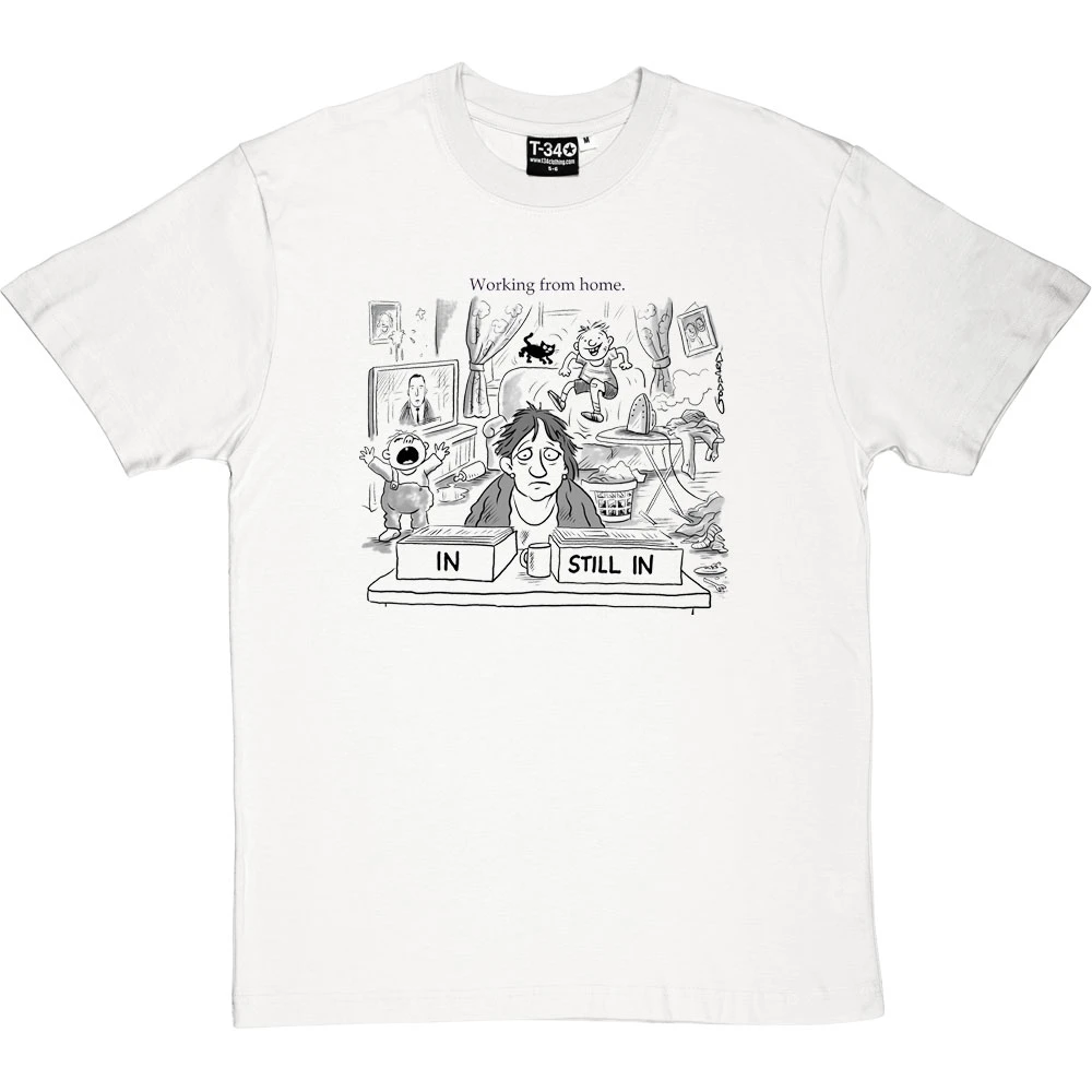The joys of working from home during a pandemic. In or still in? Whilst all manner of chaos goes on in the background. A cartoon by renowned cartoonist Clive Goddard.