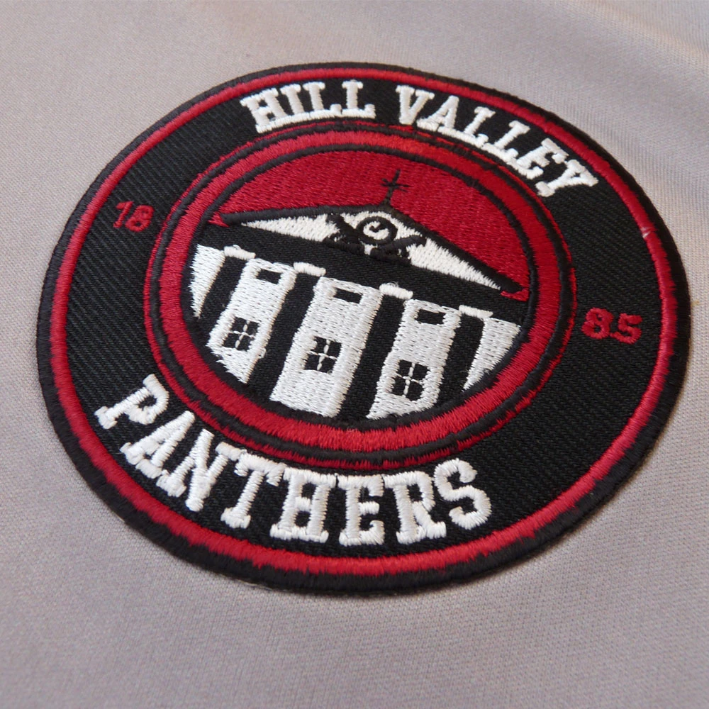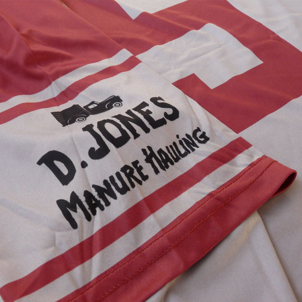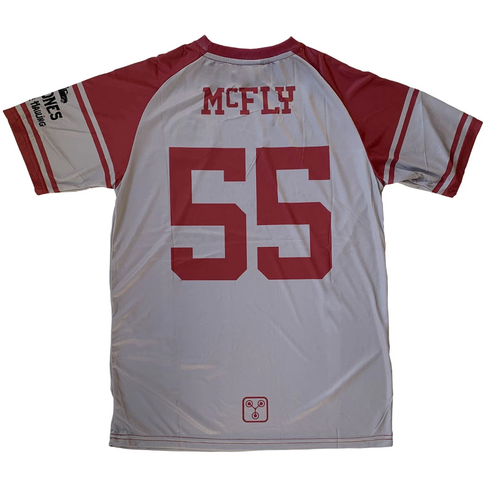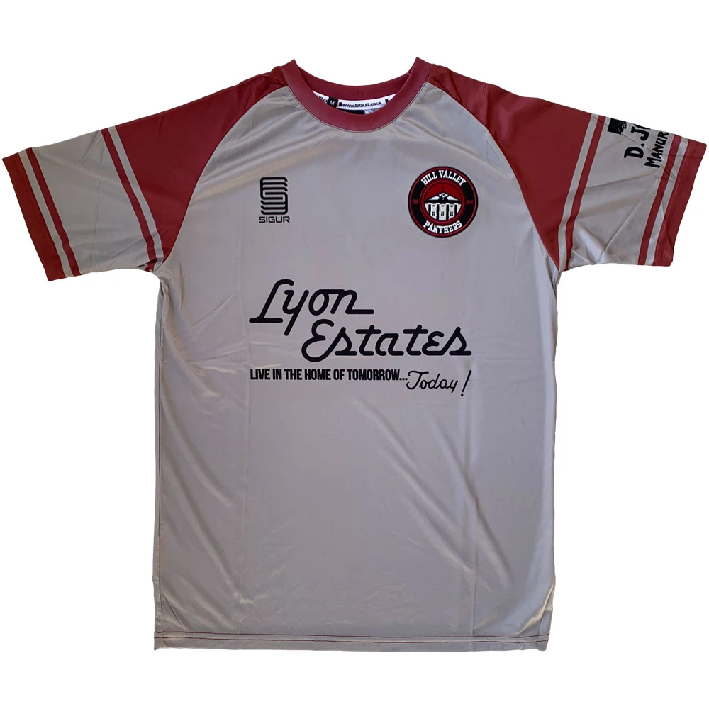 A football shirt design for the Hill Valley Panthers; fictional football team of the town featured in the Back To The Future film series. Our 1955 tribute kit features the sponsor logo of Lyon Estates (slogan: “Live in the home of tomorrow… today!”), the housing development that is beginning to be built in the 50s and which he later lives in in the 1980s, across the chest. On the sleeve is the logo of “D. Jones Manure Hauling”, whose truck Biff Tannen crashes into whilst pursuing Marty, whilst the bottom rear of the top features a logo based on the Flux Capacitor – the key component in Doc’s time-travelling DeLorean. The embroidered badge design features an image of the Hill Valley town hall (complete with panthers), alongside the date 1885 – the year the town was founded as seen in the third part of the film series. The name and number on the back are McFly (in tribute to the film’s hero Marty) and 55 (the year he travelled to in the first film). The colours and pattern of the shirt reference the 50’s jacket that Marty wears in the first film.