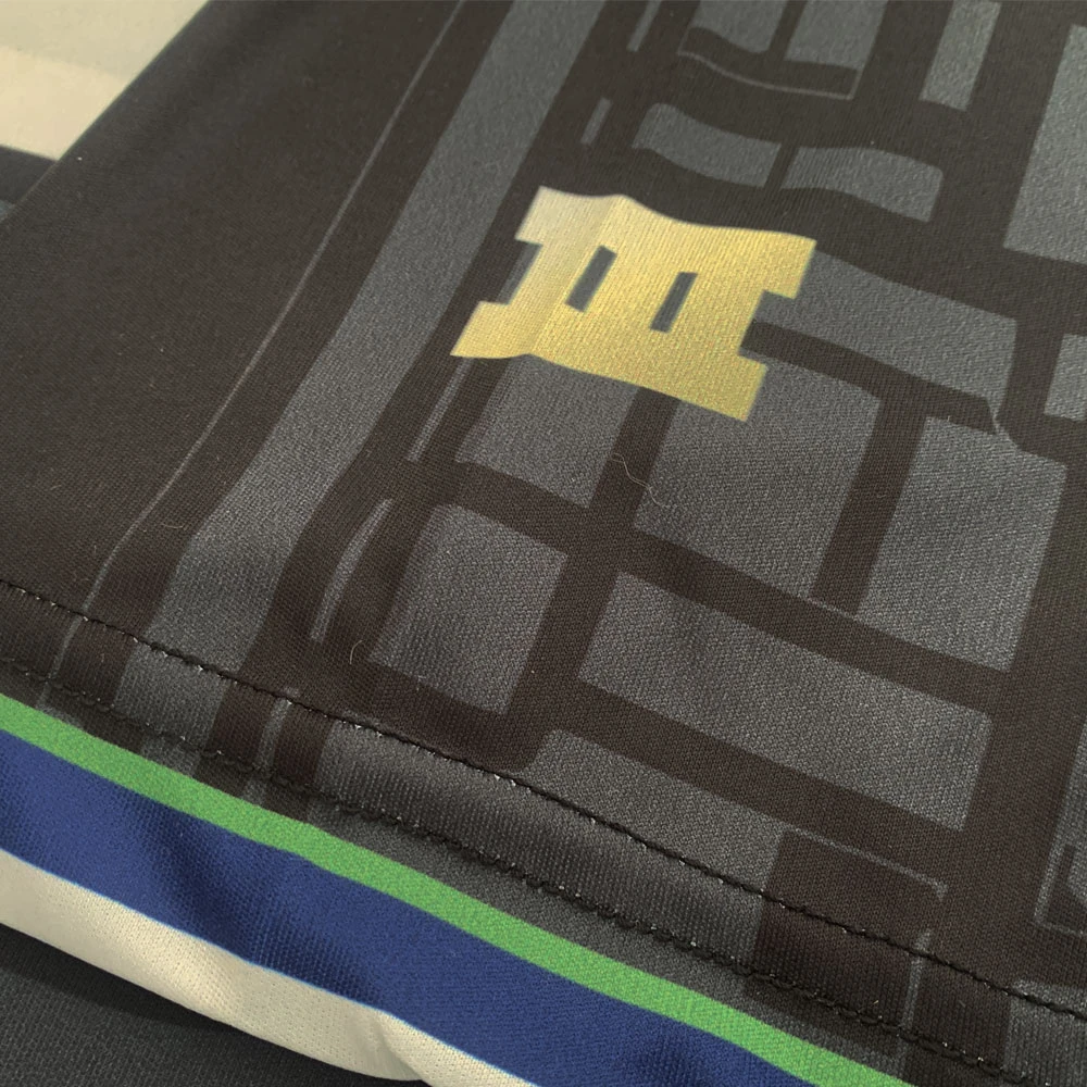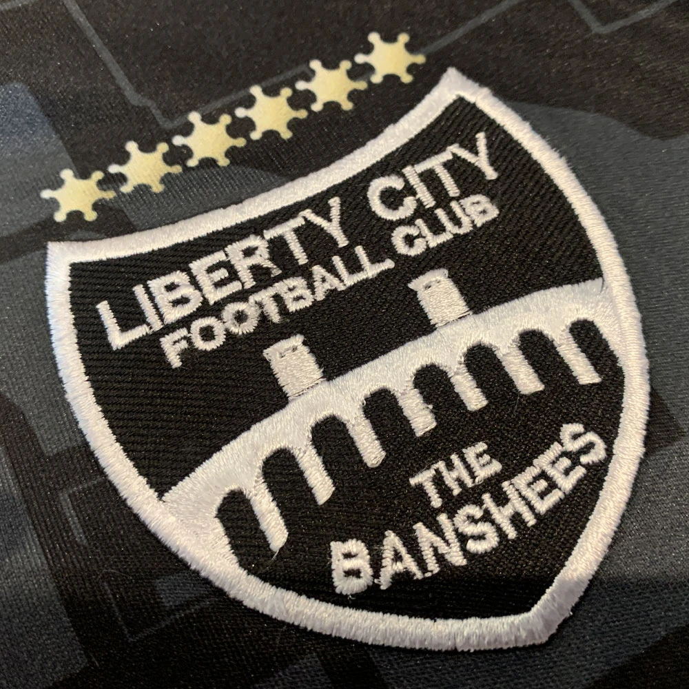 An exclusive football shirt for the fictitious “Liberty City Football Club”, based on the cult game “Grand Theft Auto III”. Our shirt features the full map of Liberty City as the background pattern with the colours taken from main character Claude’s outfit. The embroidered badge on the front features Chochrane Dam located on Shoreside Vale with 6 wanted stars above it, whilst the nickname “The Banshees” is taken from the make of one of the sports cars in the game. The shirt front sponsor is “Ammu-nation”, the gun store featured in the game, with the sleeve sponsor “Head Radio” being one of the stations you can listen to while driving.