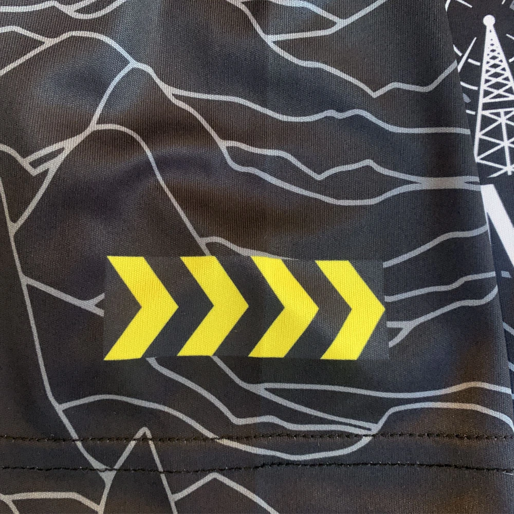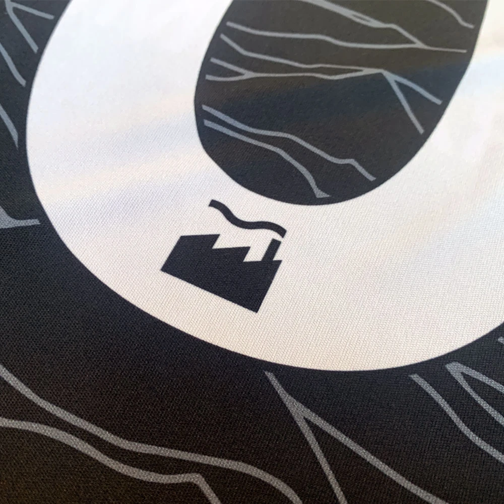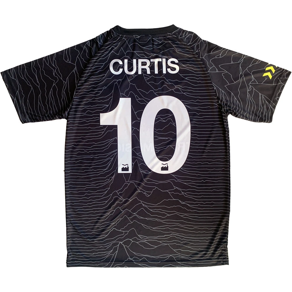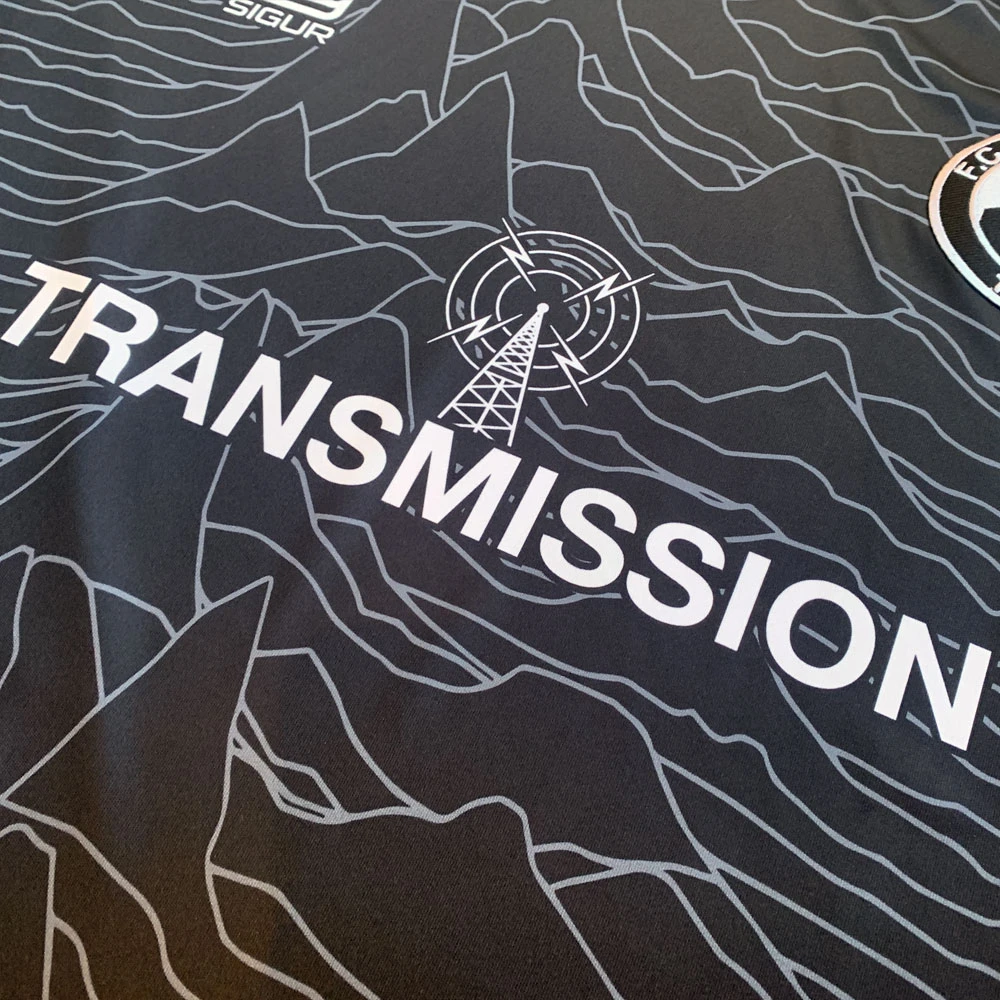 The rear of the shirt features the name “Curtis”, after the band’s lead singer Ian Curtis, and the number 10; referencing the FACT10 serial number of the Unknown Pleasures album. The numbers also feature small factory logos, while the sleeve has a print of a Factory/Hacienda-inspired black and yellow chevron pattern. The front sponsor on the shirt is “Transmission” in reference to the band’s first single and one of their most famous songs.