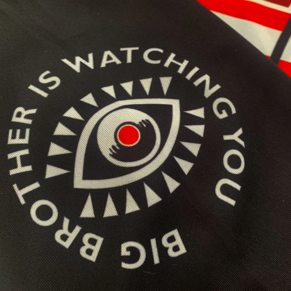 This exclusive football shirt is inspired by George Orwell’s classic dystopian novel “Nineteen Eighty-Four”. Printed in the black and red colour scheme so often used in depictions of Oceania, the shirt featured the embroidered badge of “Airstrip One Football Club” – based on the name of the country once known as Great Britain where the novel is set. The main shirt sponsor is “Victory Gin”; one of the few vices allowed by the party, although more as a means of suppressing emotion and rebellion rather than as a way of deriving pleasure. The sleeve prints feature the logo of Ingsoc (Newspeak for “English Socialism”: the political philosophy of Oceania involving cult-like worshipping and veneration of the ruler, Big Brother), with the other sleeve showing a stylised eye with the words “Big Brother Is Watching You” around it.