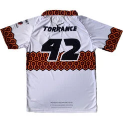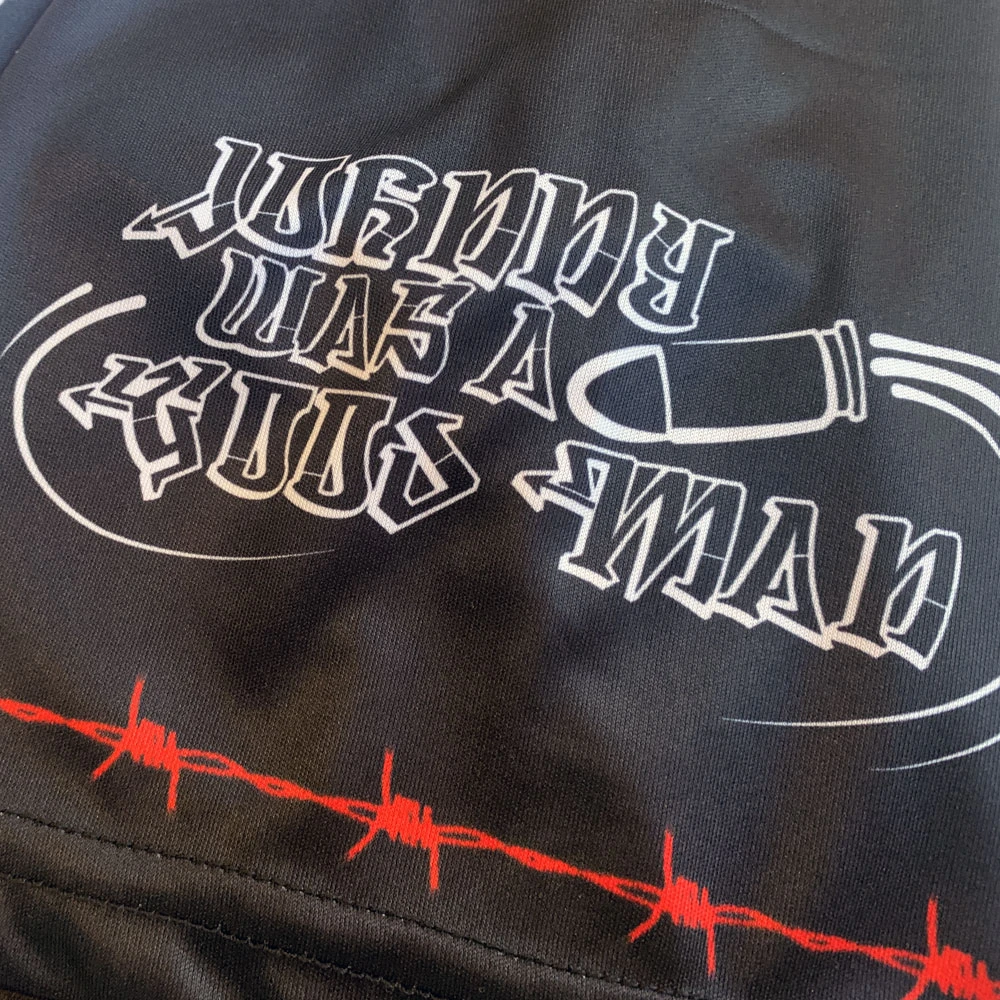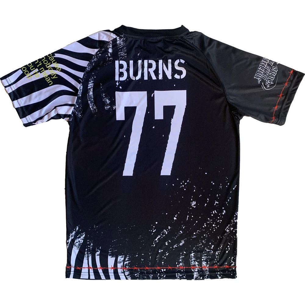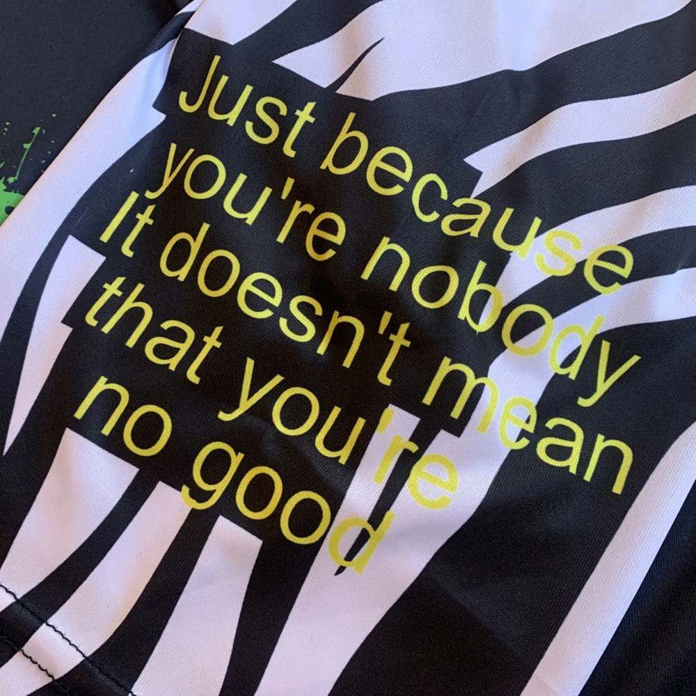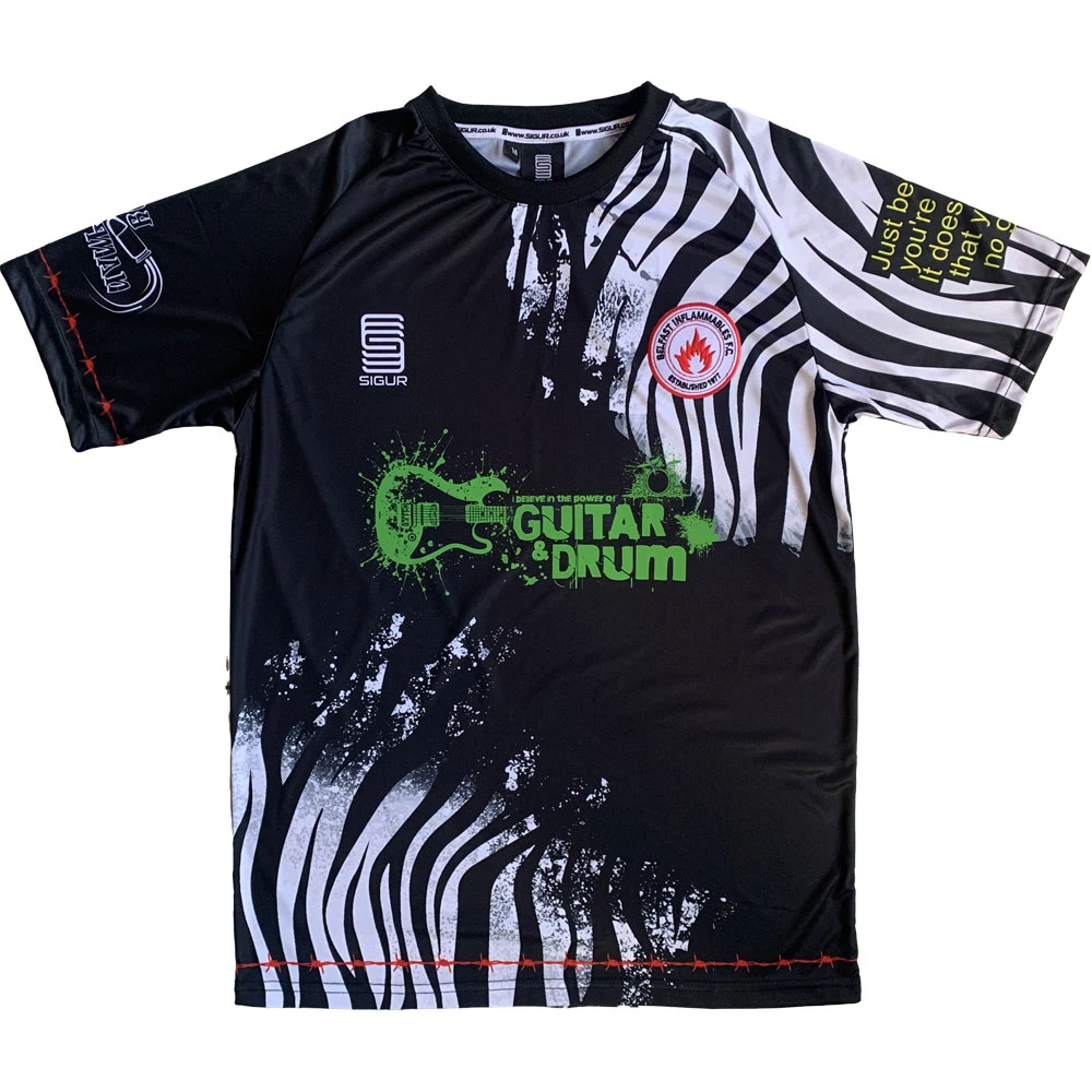 The design of our Stiff Little Fingers shirt is inspired by their 2015 “Still Kicking” album cover. ‘Just because you’re nobody doesn’t mean that you’re no good’, lyrics from the 1980 track “Doesn’t Make It Alright” appear on the left sleeve. Our main sponsor, ‘I believe in the power of guitar and drum’, features lyrics from “Guitar & Drum”. The right arm features lyrics from the track “Johnny Was”, alongside a bullet motif.