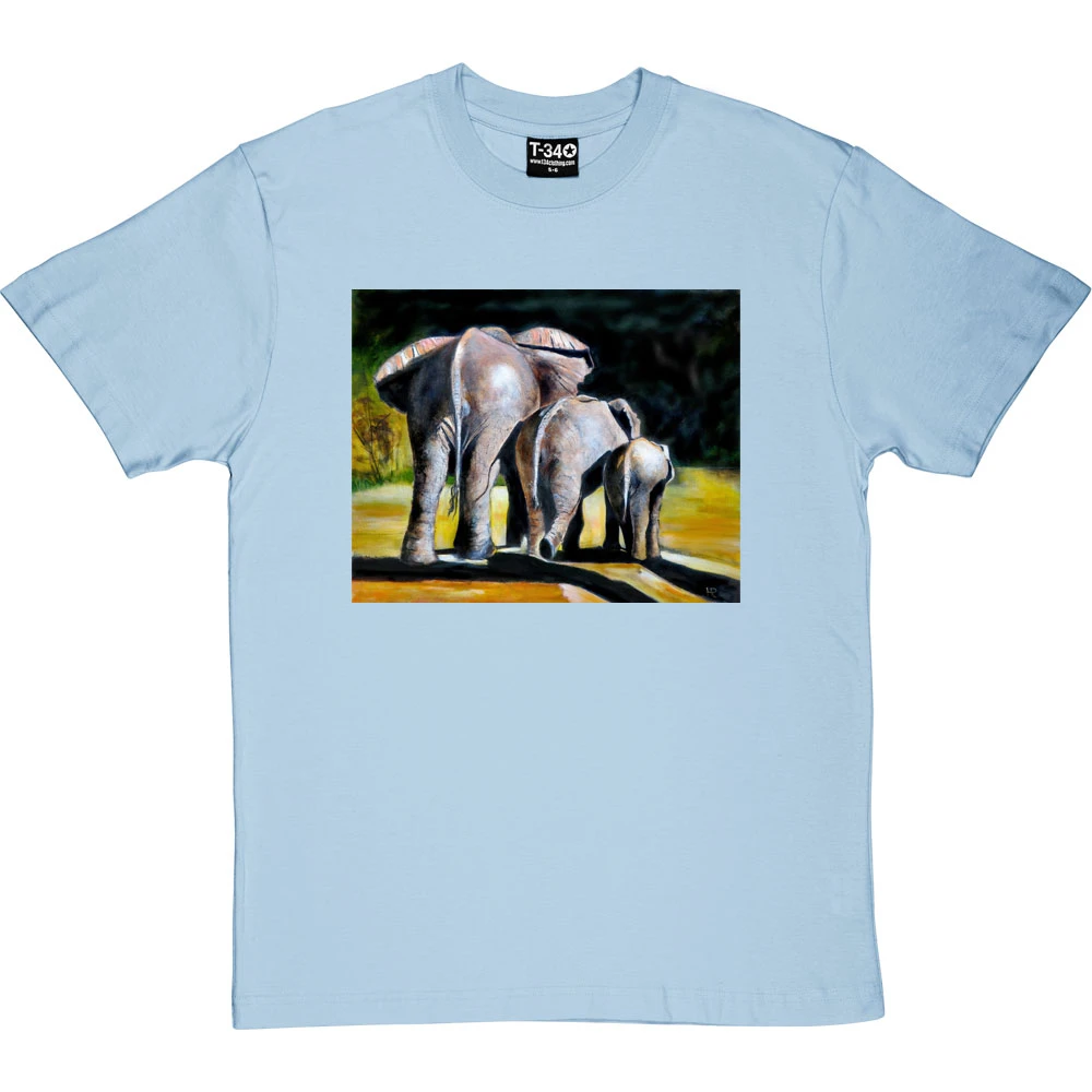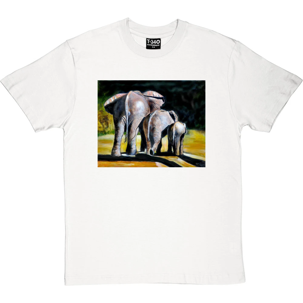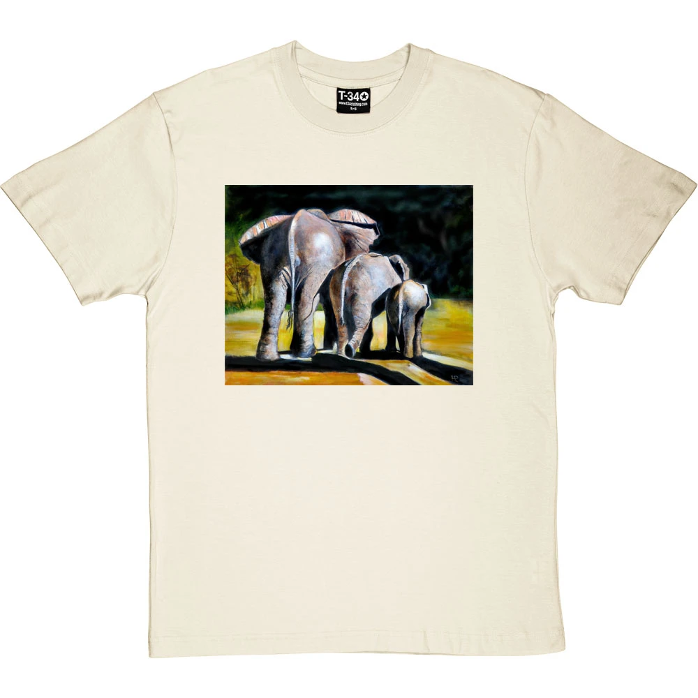 An image based on an original artwork by painter Hadrian Richards depicting elephants walking together in their natural environment.