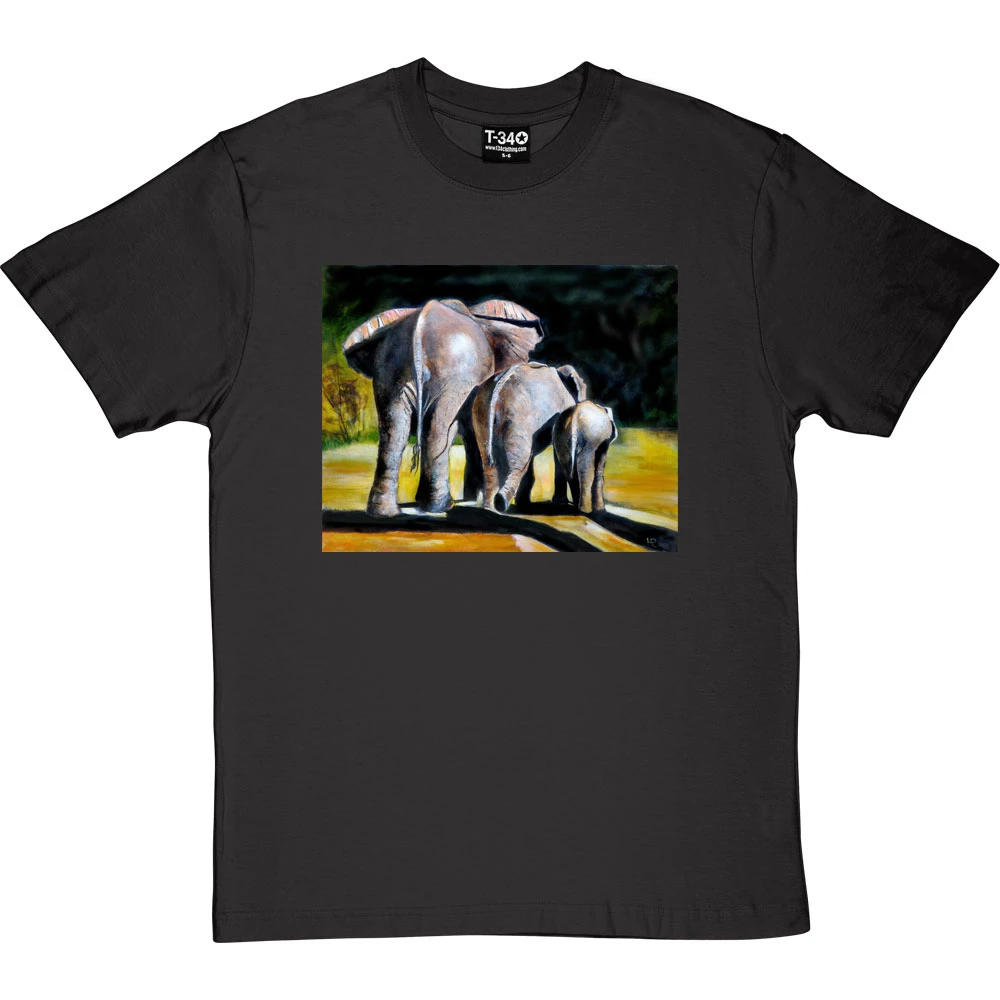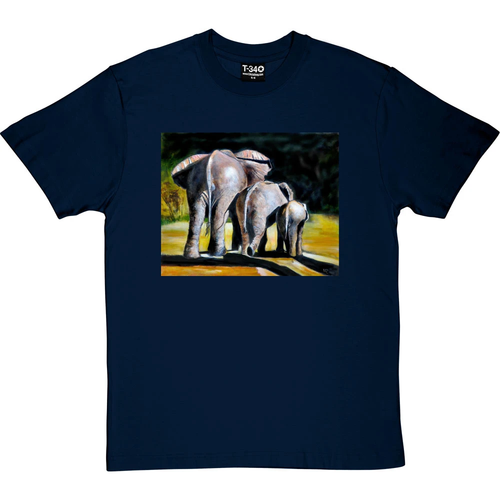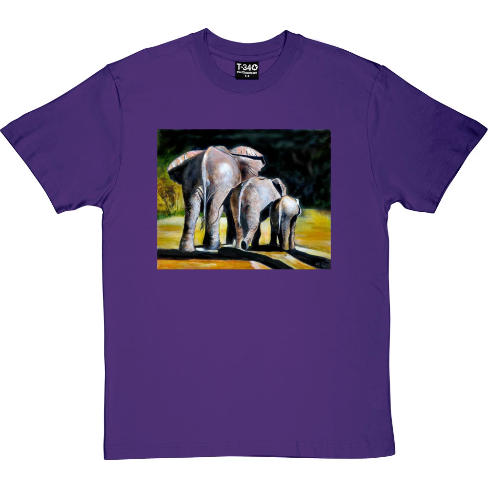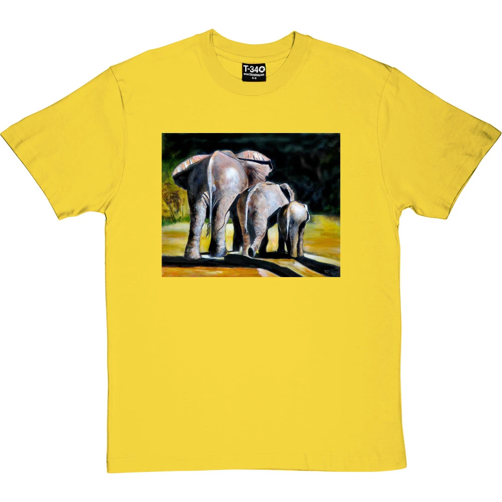 An image based on an original artwork by painter Hadrian Richards depicting elephants walking together in their natural environment.