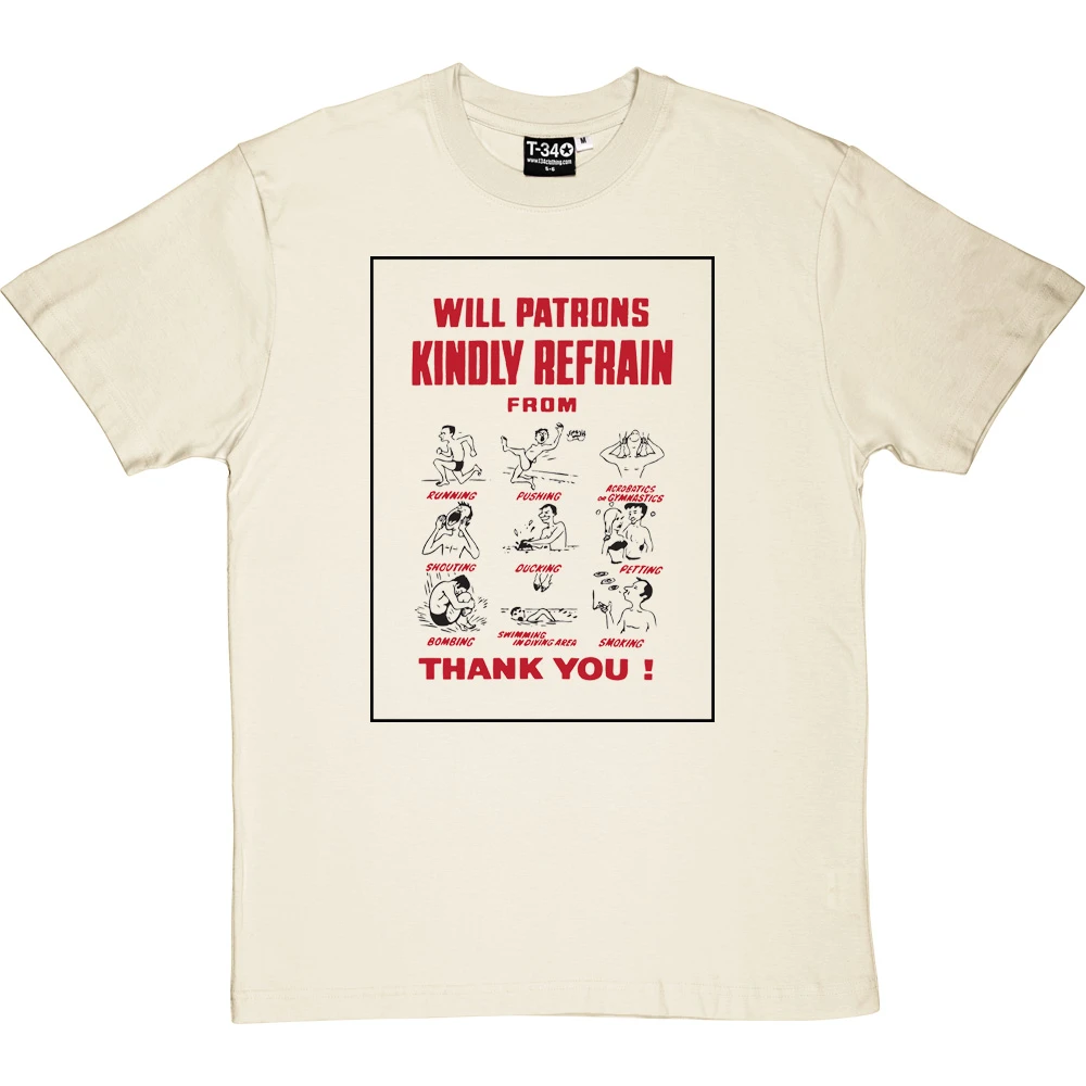 The classic pool safety sign from the 1970s, warning all swimmers of the perils of such things as smoking, bombing and… er… petting.