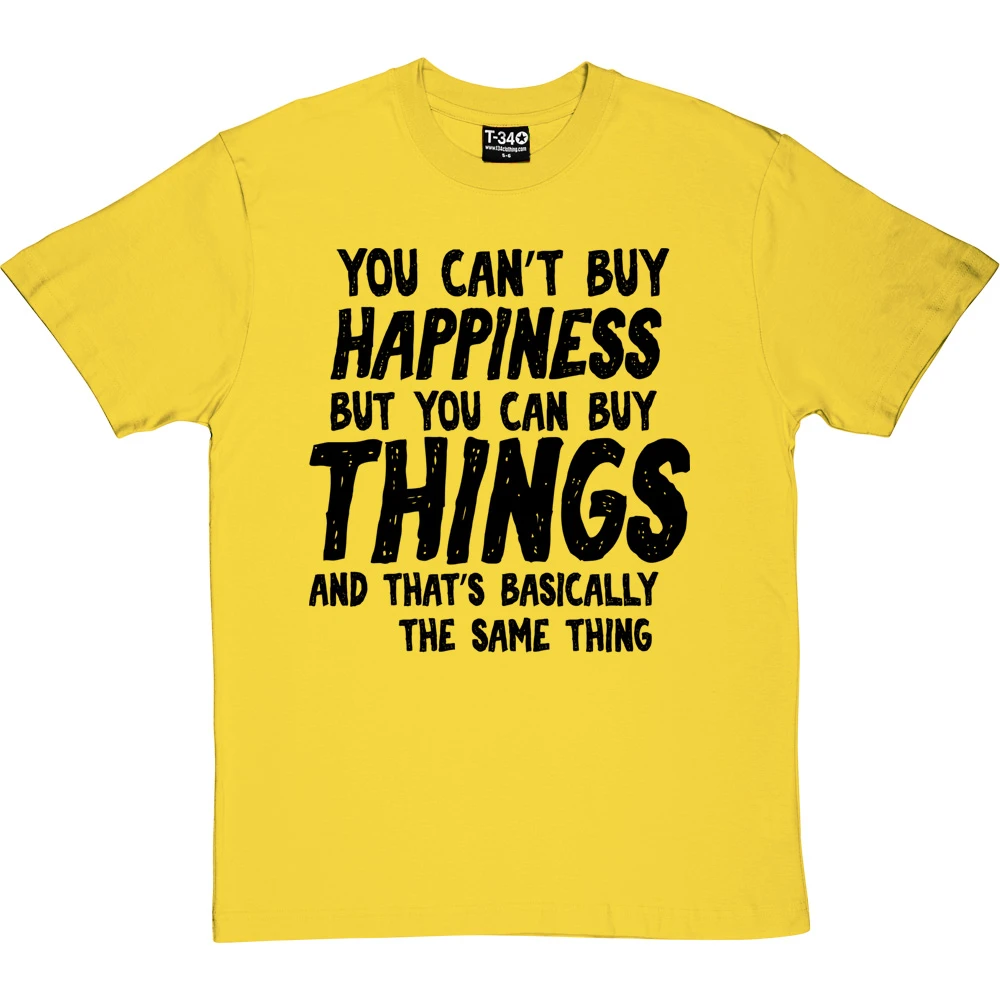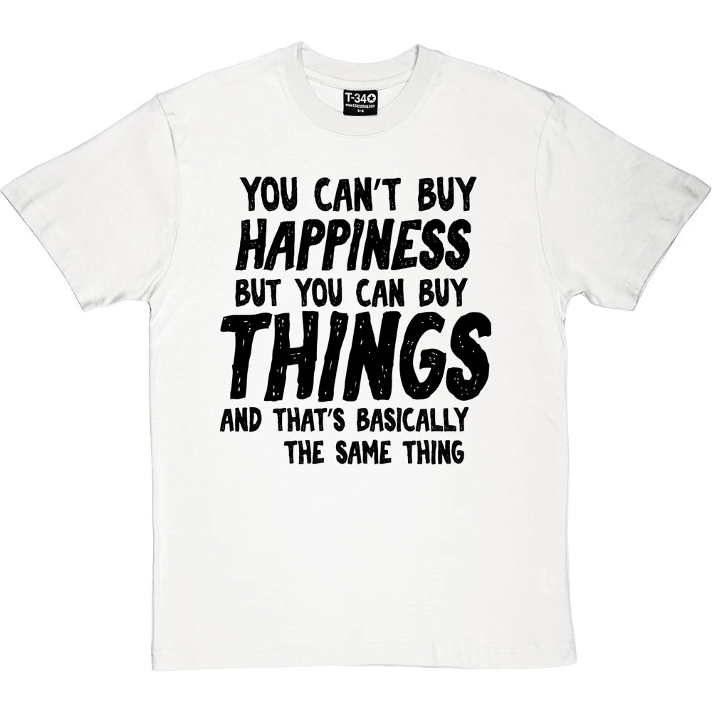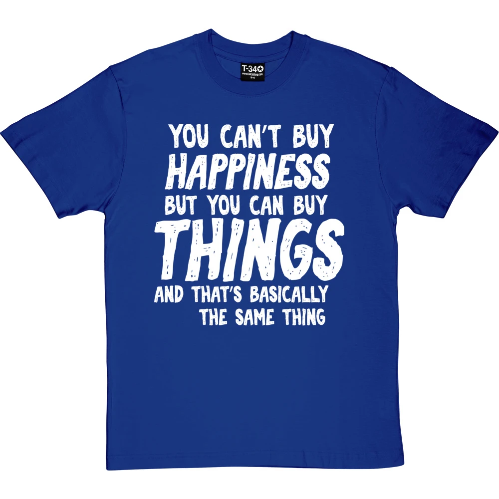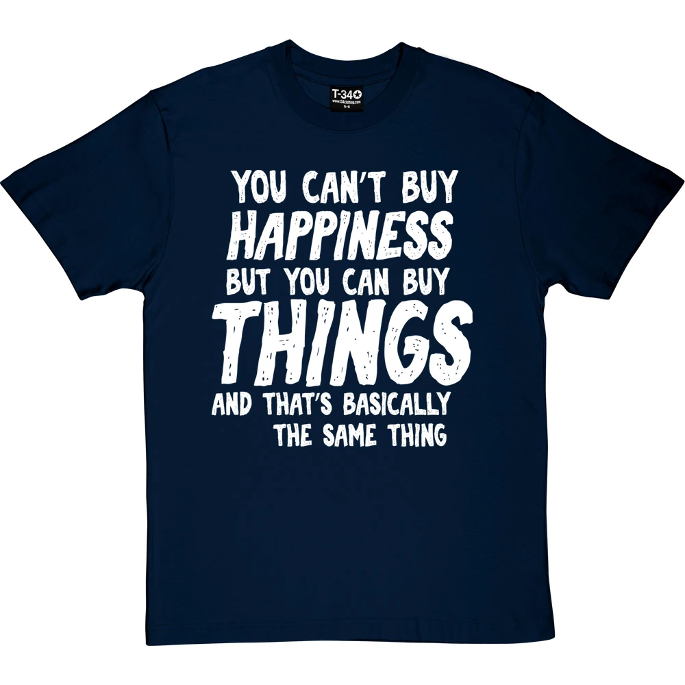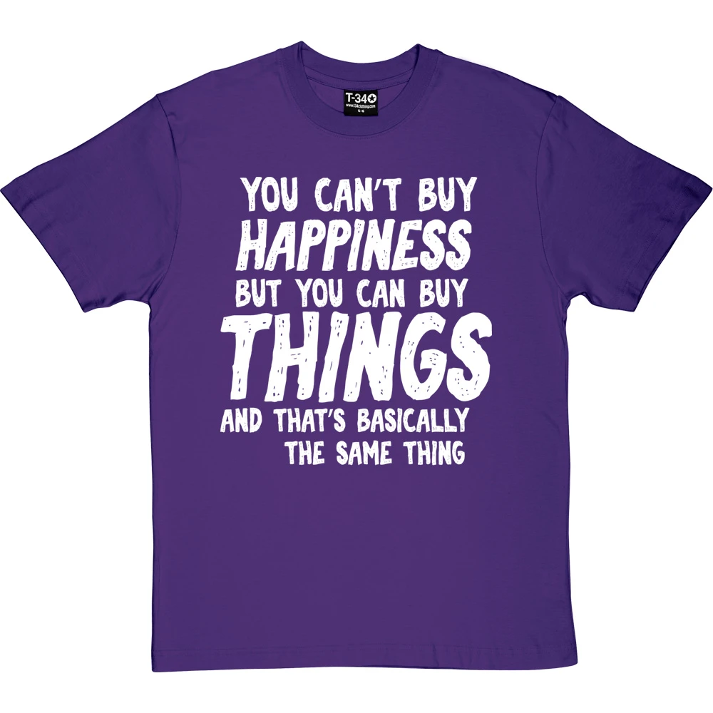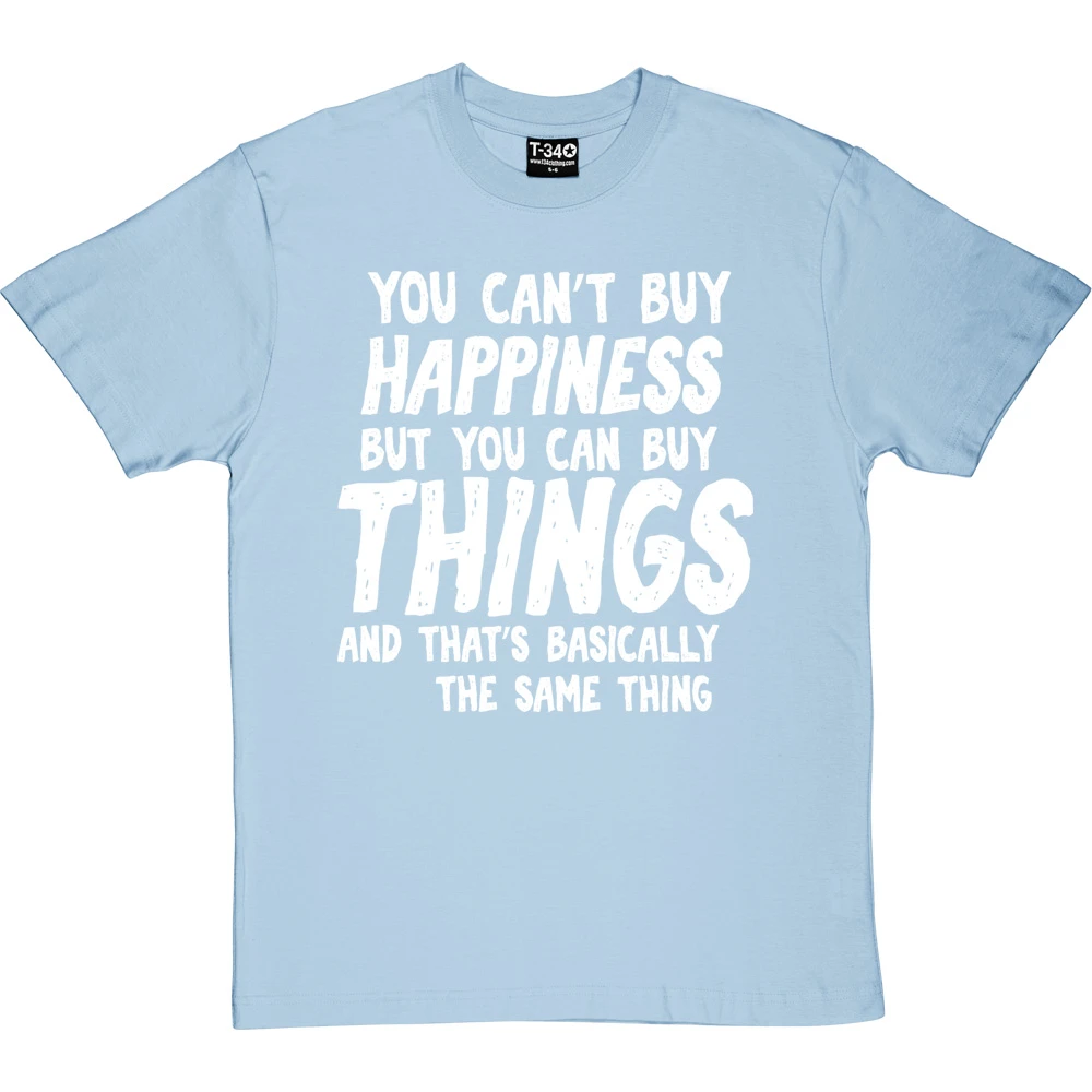 The personalisation should fit into the sentence ‘You can’t buy happiness but you can buy ________ and that’s basically the same thing’. If it does not fit within the sentence, we will contact you to discuss before we print the garment.